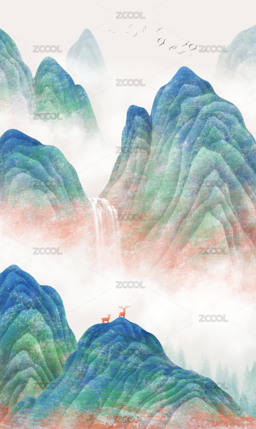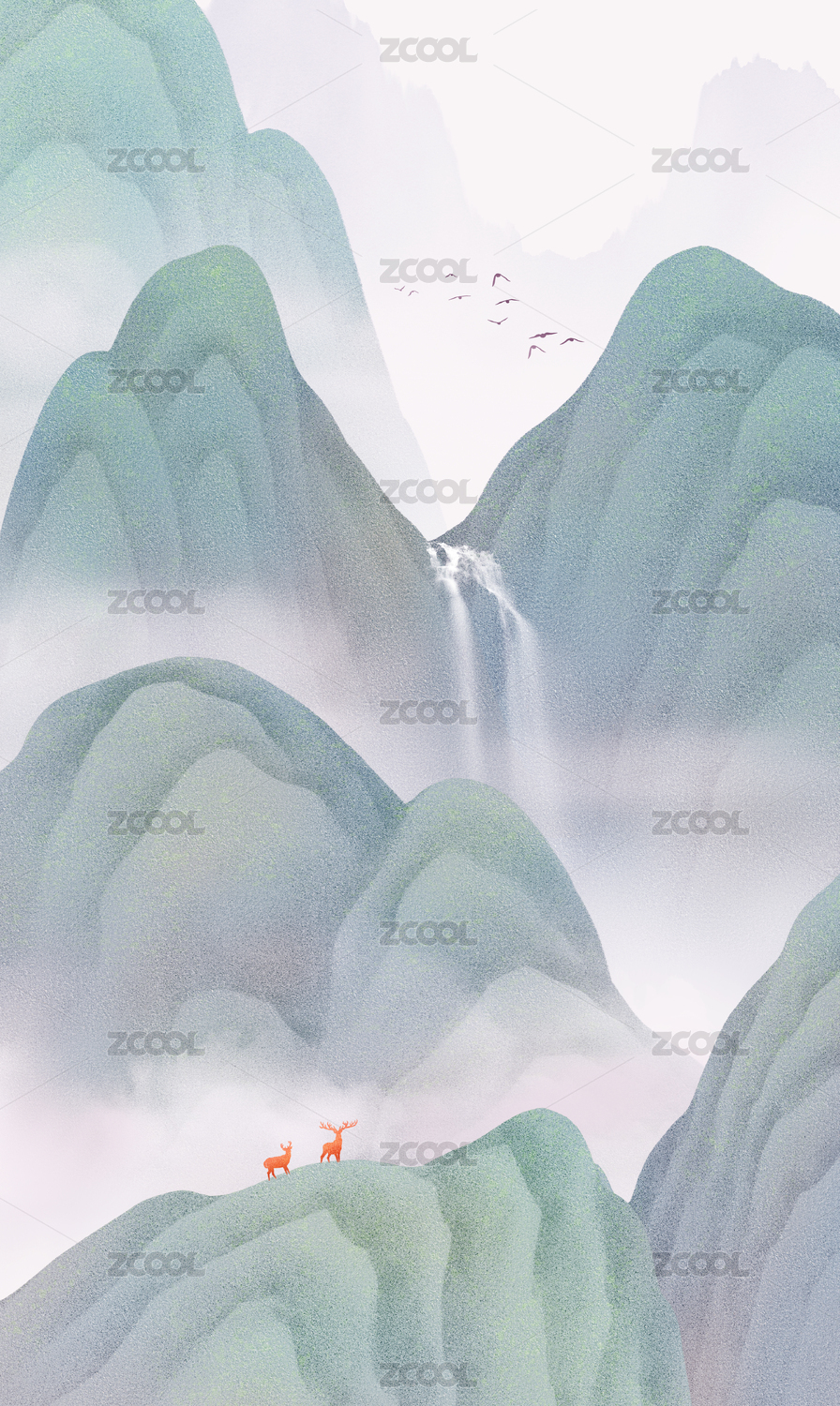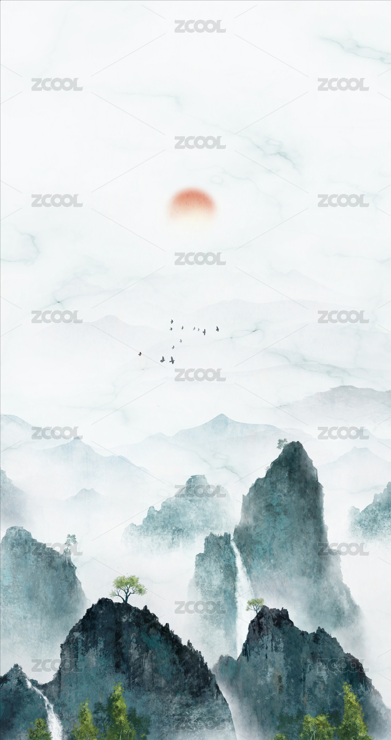 插画,山水,山水画,水墨画,山脉,风景,鸟类,装饰画,新中式风格,国风