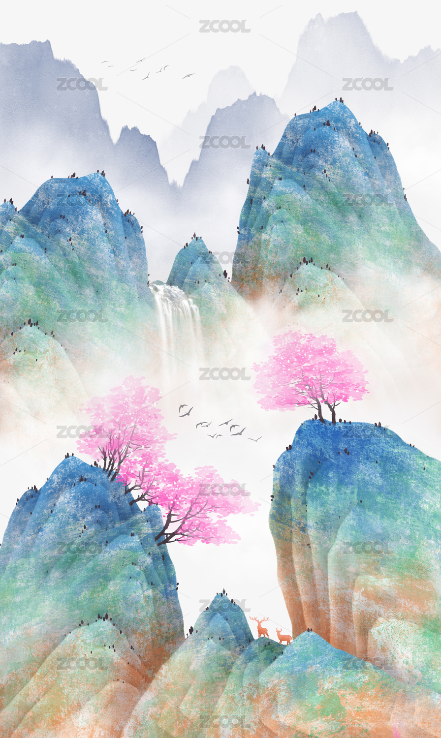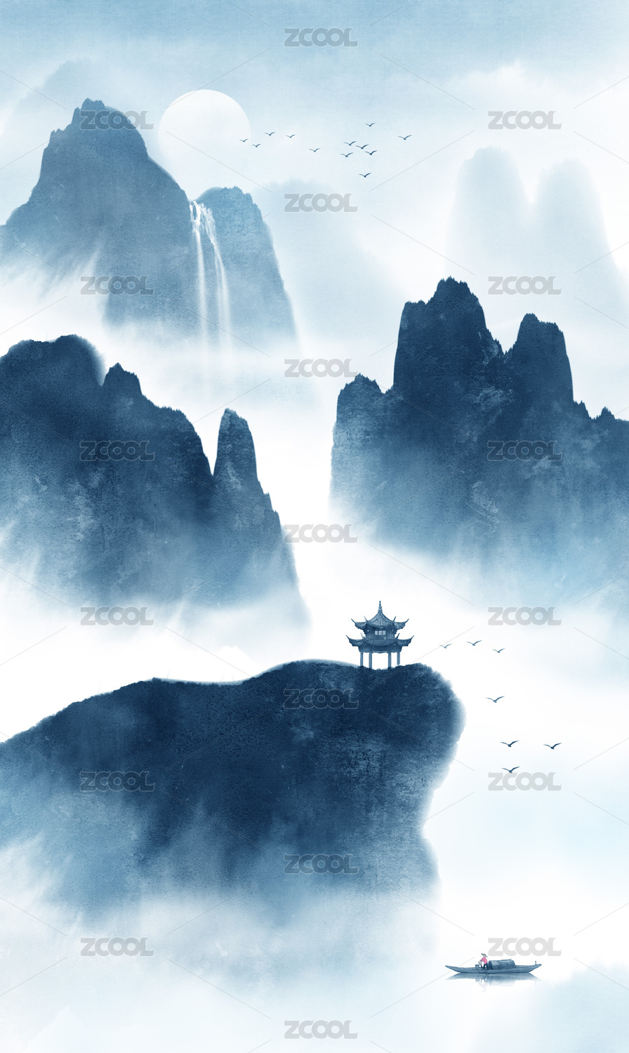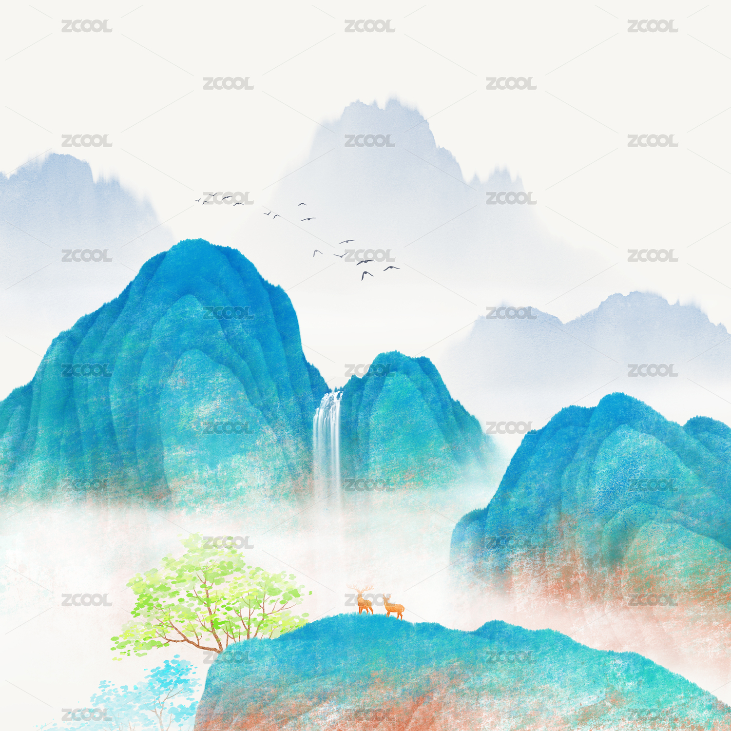 插画,山水,山水画,水墨画,山脉,风景,鸟类,装饰画,新中式风格,国风