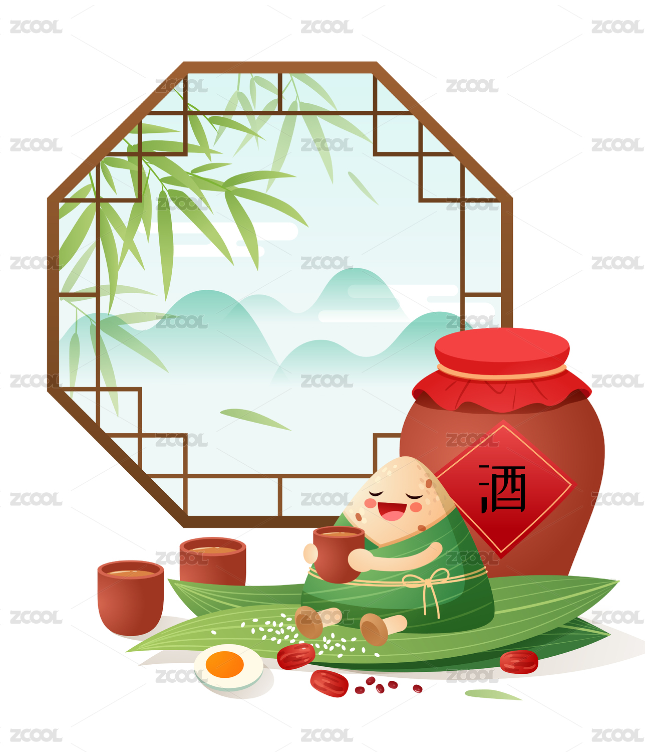一个坐在粽叶上喝酒的粽子和酒坛花窗等背景
