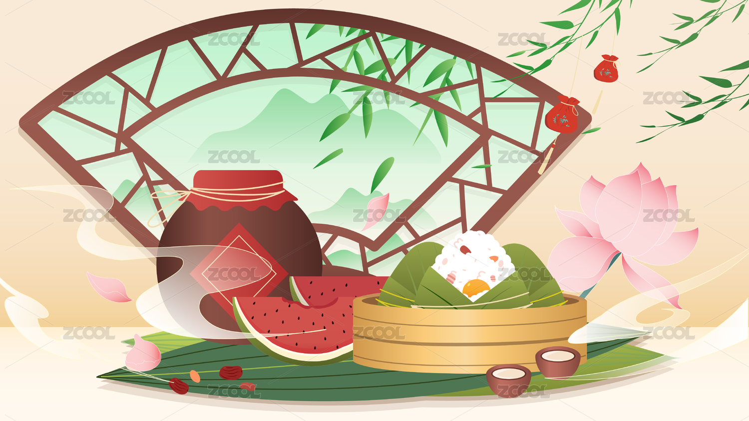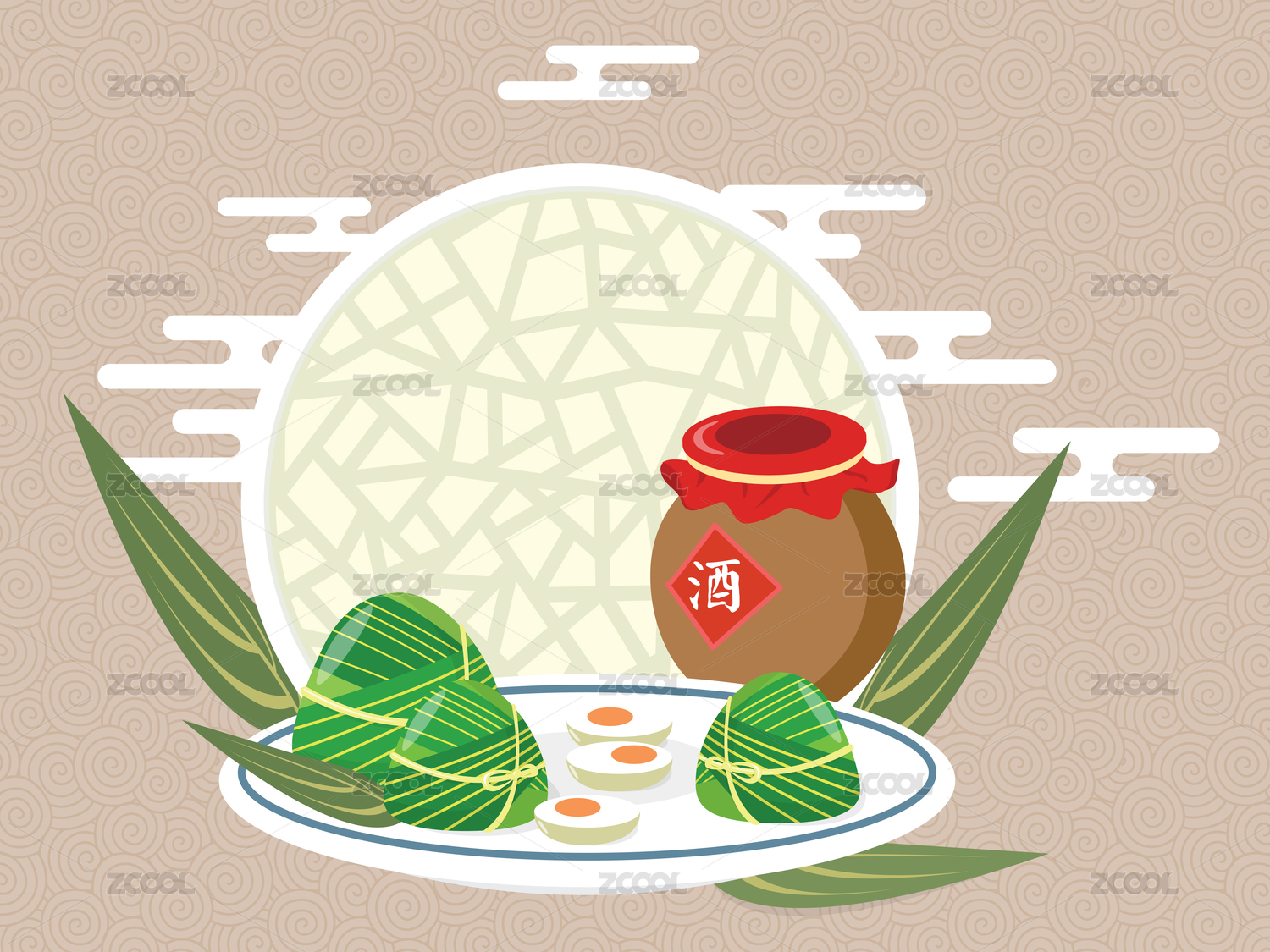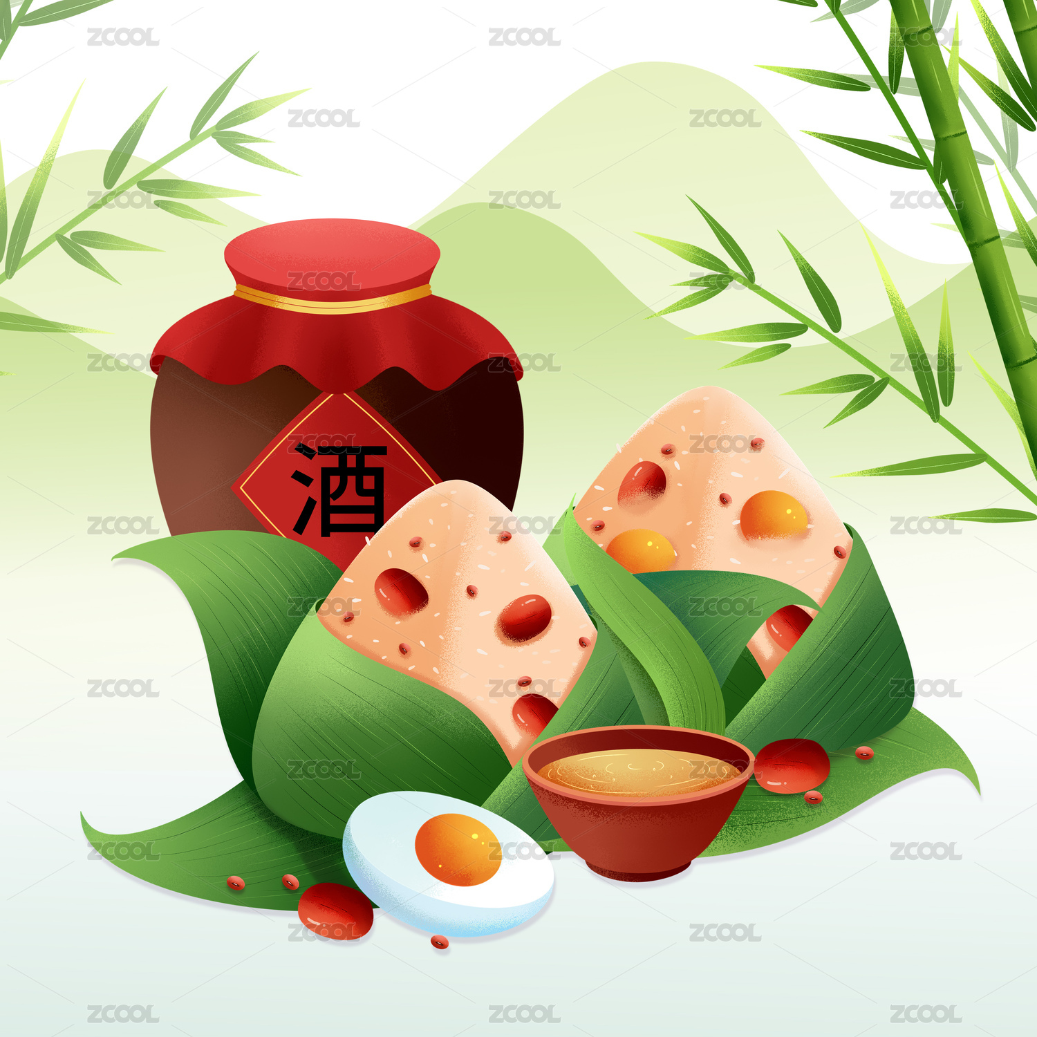 端午节山水美酒粽子鸭蛋糯米插画矢量图