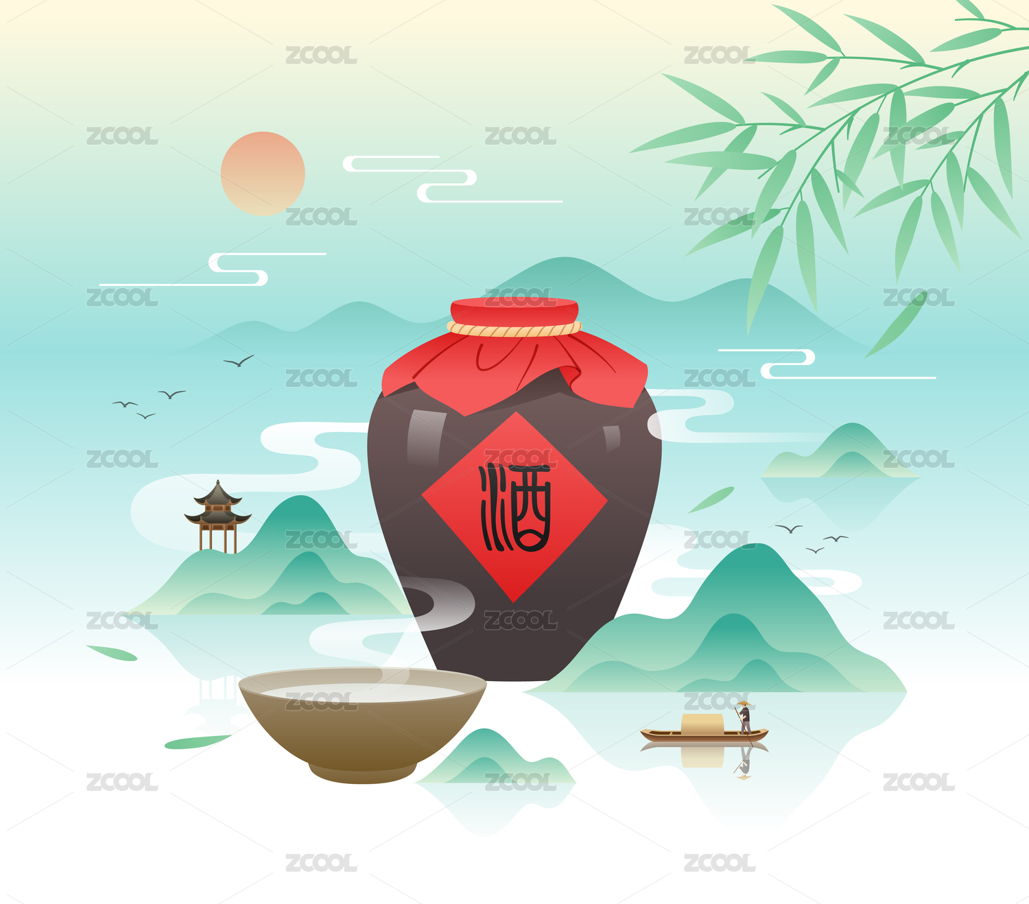 国潮古风端午节山水美酒粽子糯米插画矢量图
