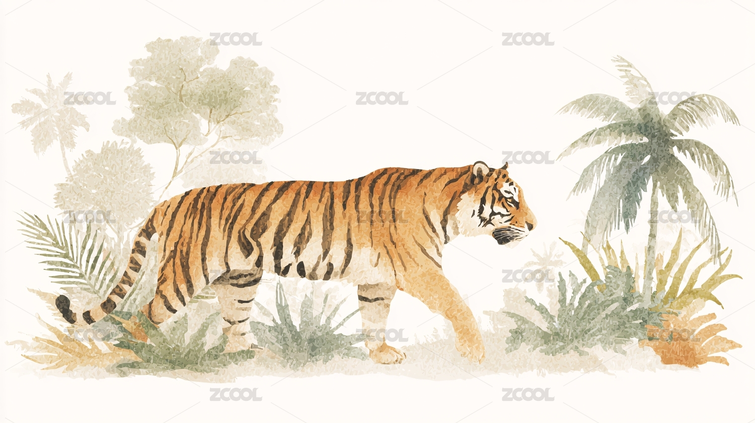 水彩风格老虎于丛林行走