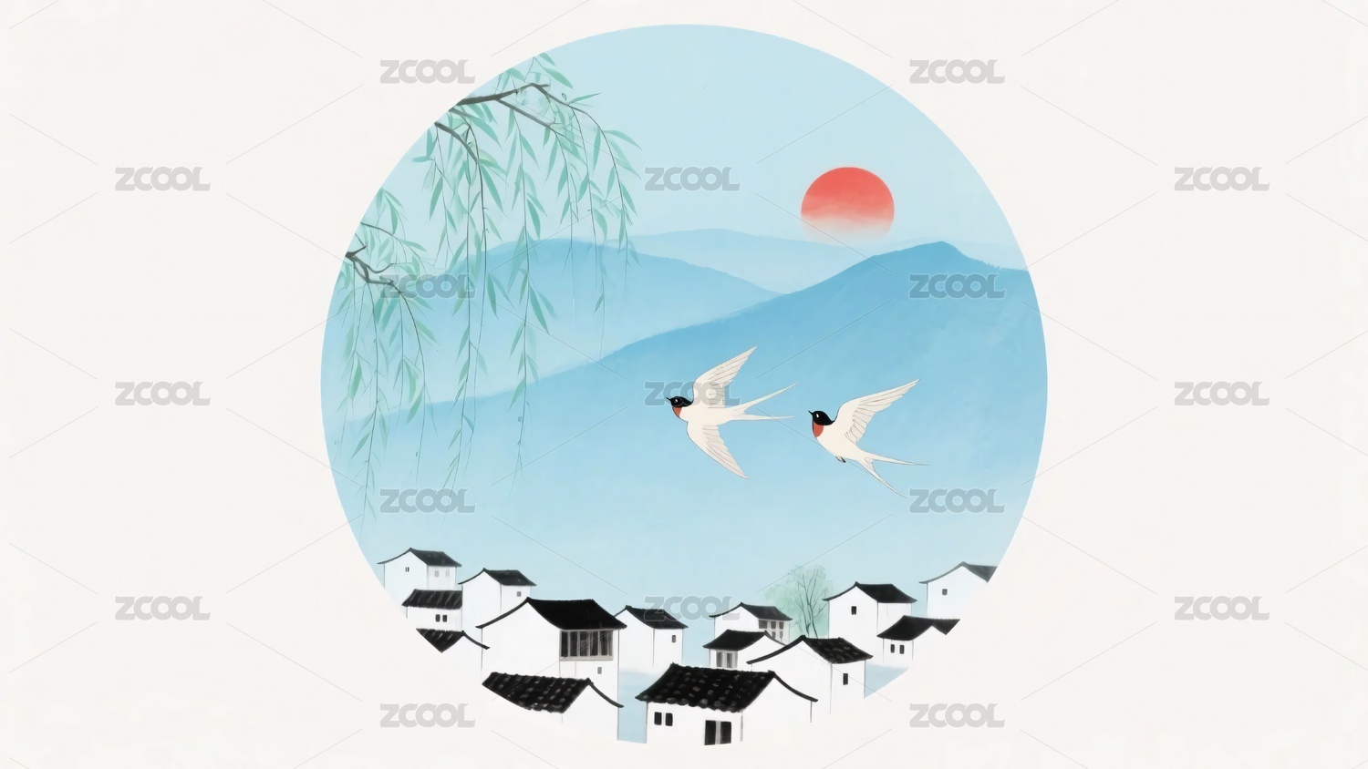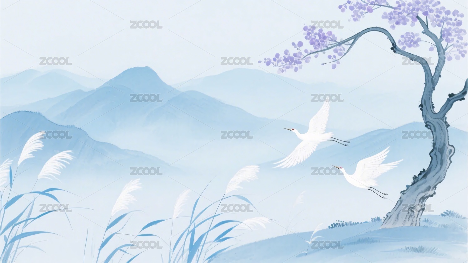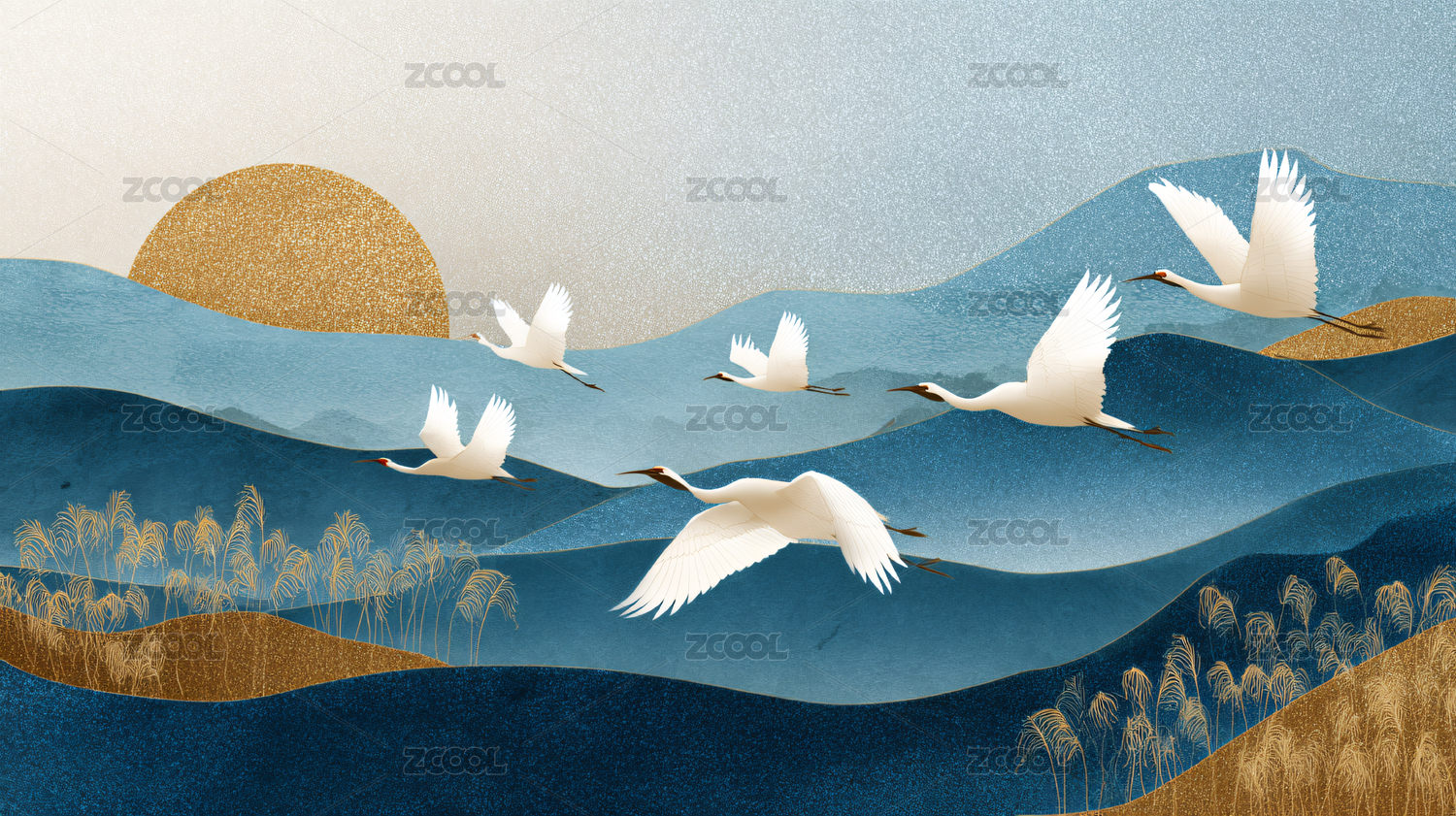 山水风景仙鹤国潮装饰中国风自然插画海报