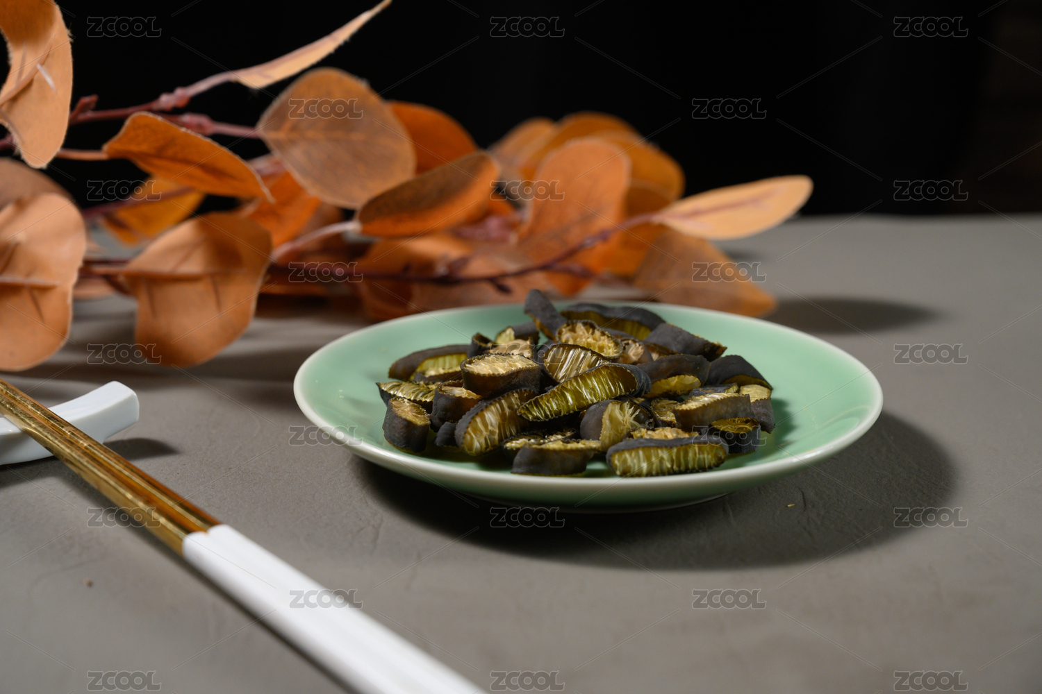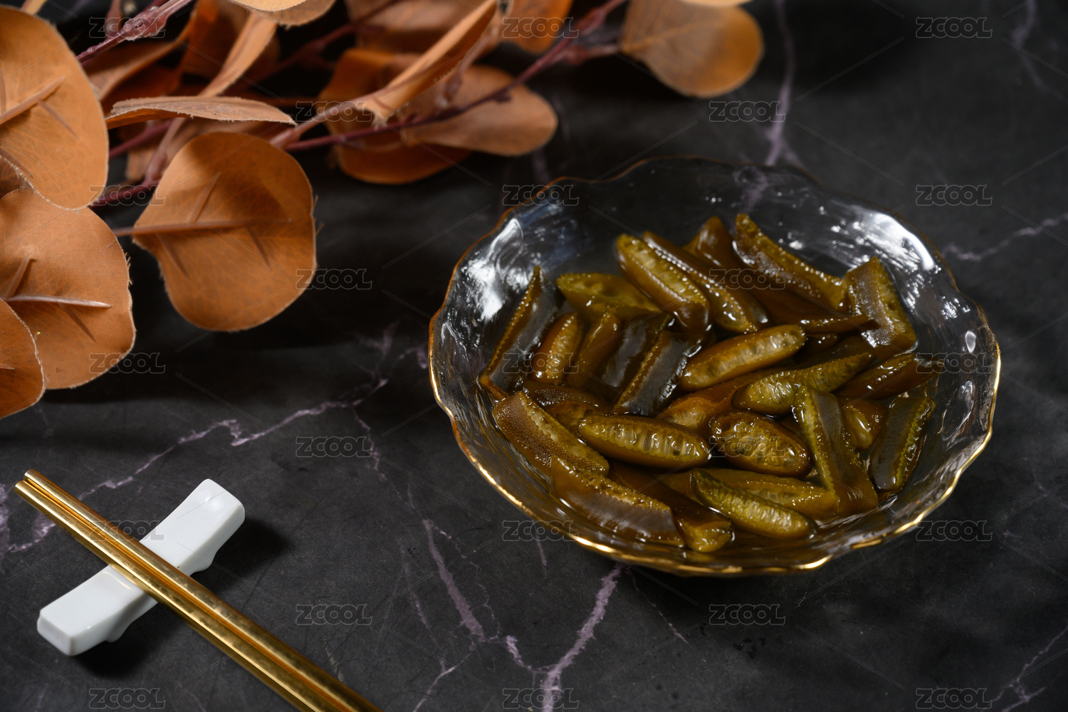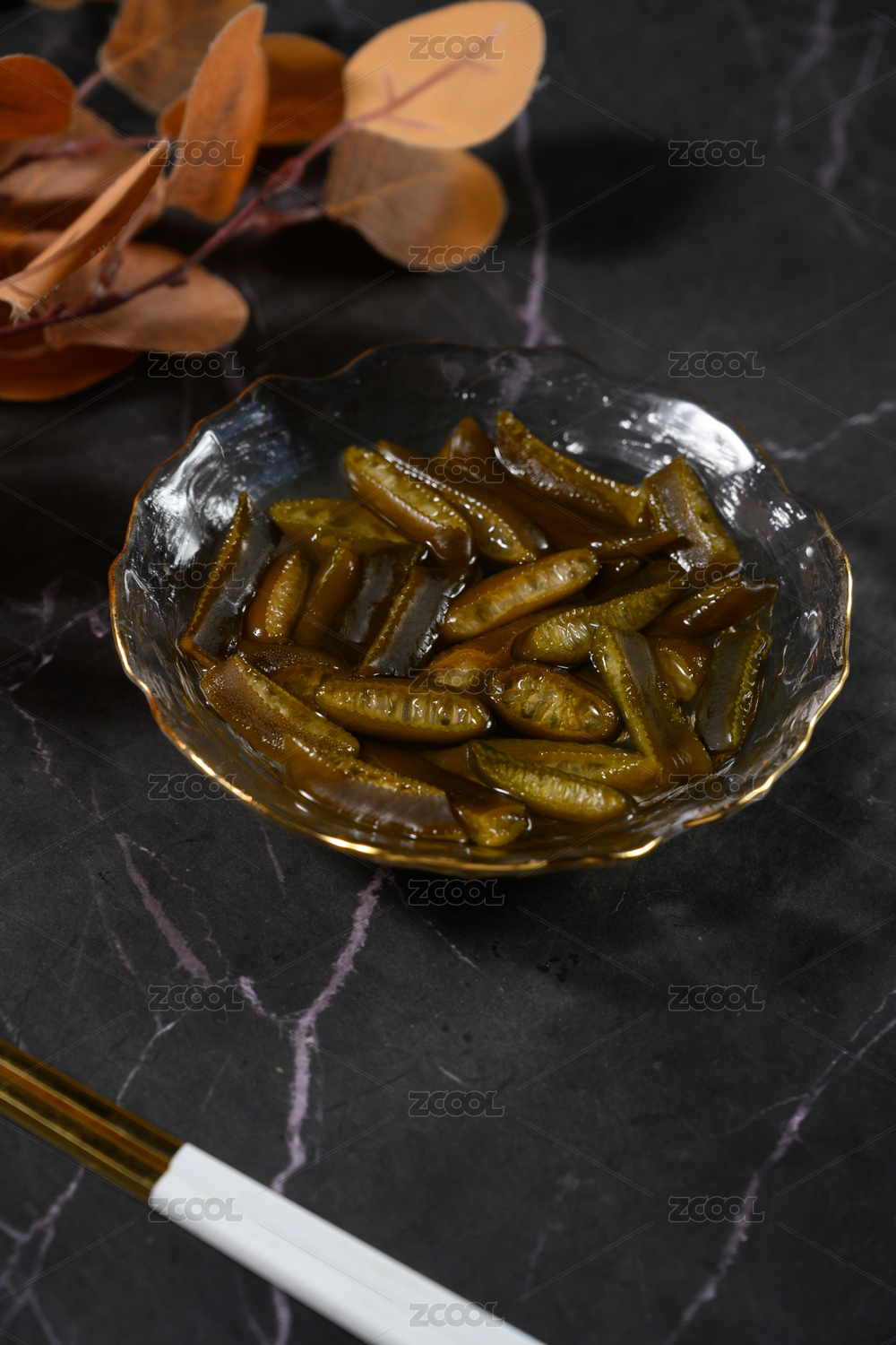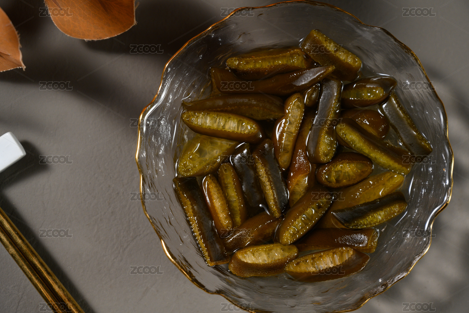 桌面上的盘子里的美味可口的酸黄瓜皮