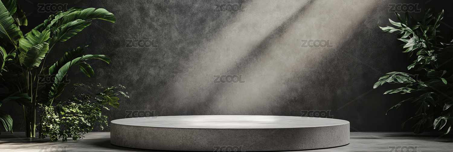 阳光照射的植物和水泥板展台空间