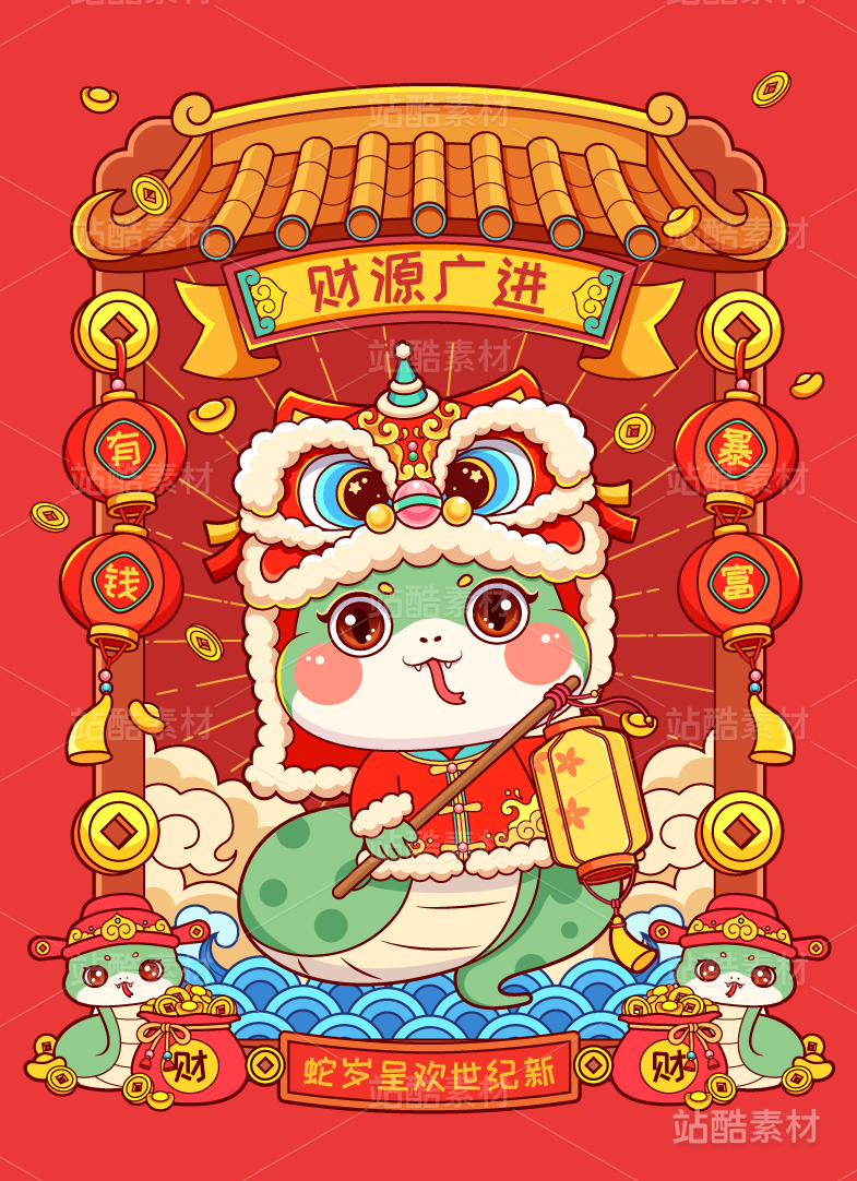 蛇年招财进宝国潮矢量插画
