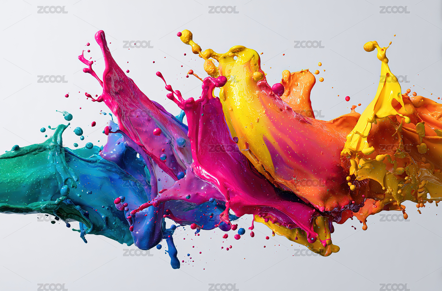白色背景下彩色颜料油漆在空中飞溅碰撞背景