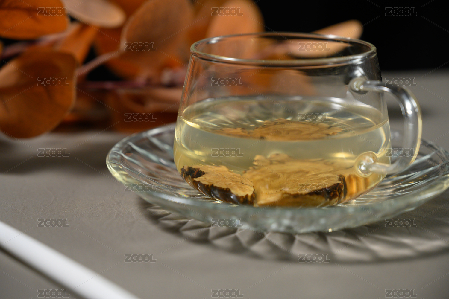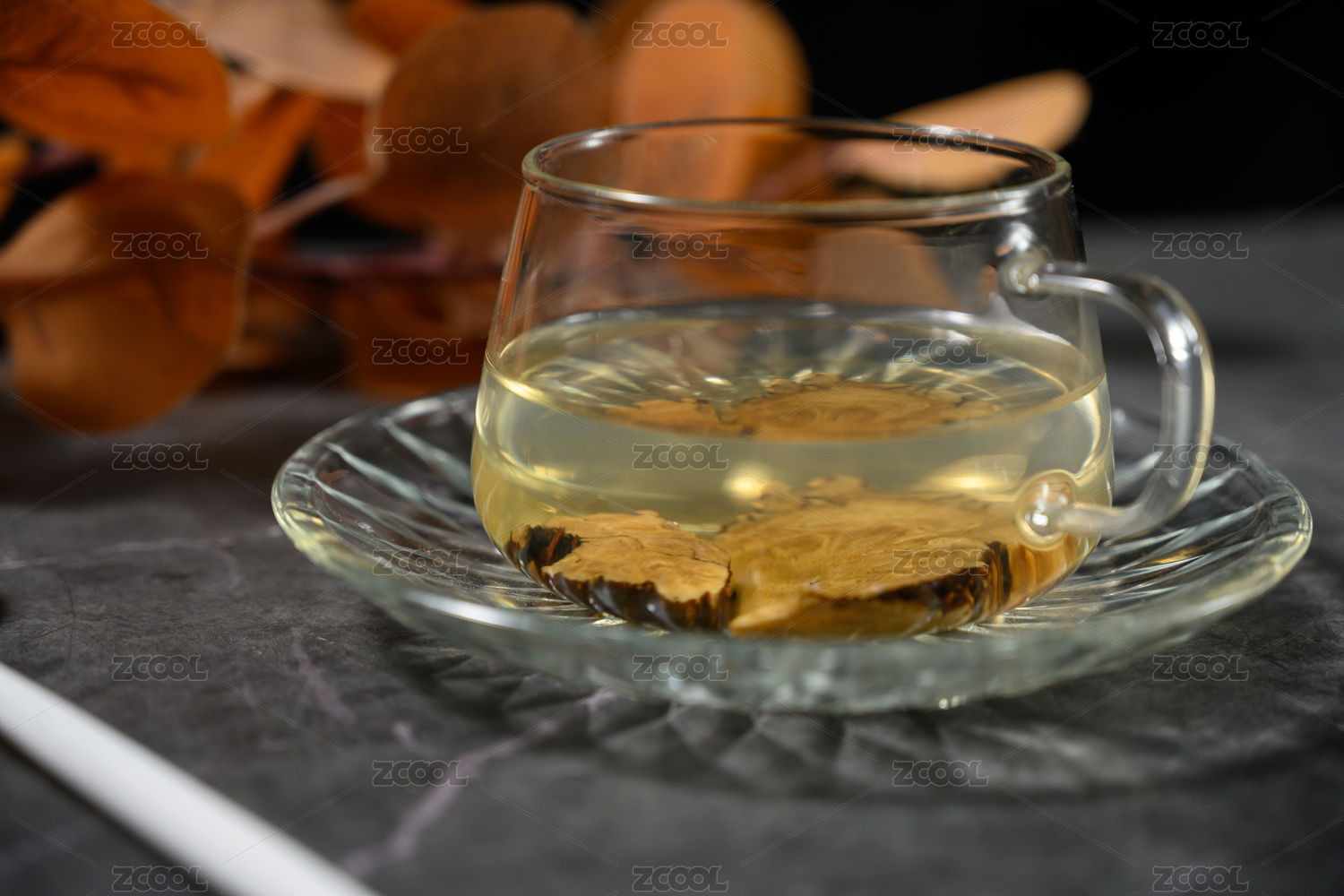 桌面上的杯子里的甘甜可口的陈皮白茶