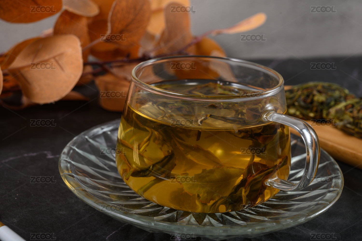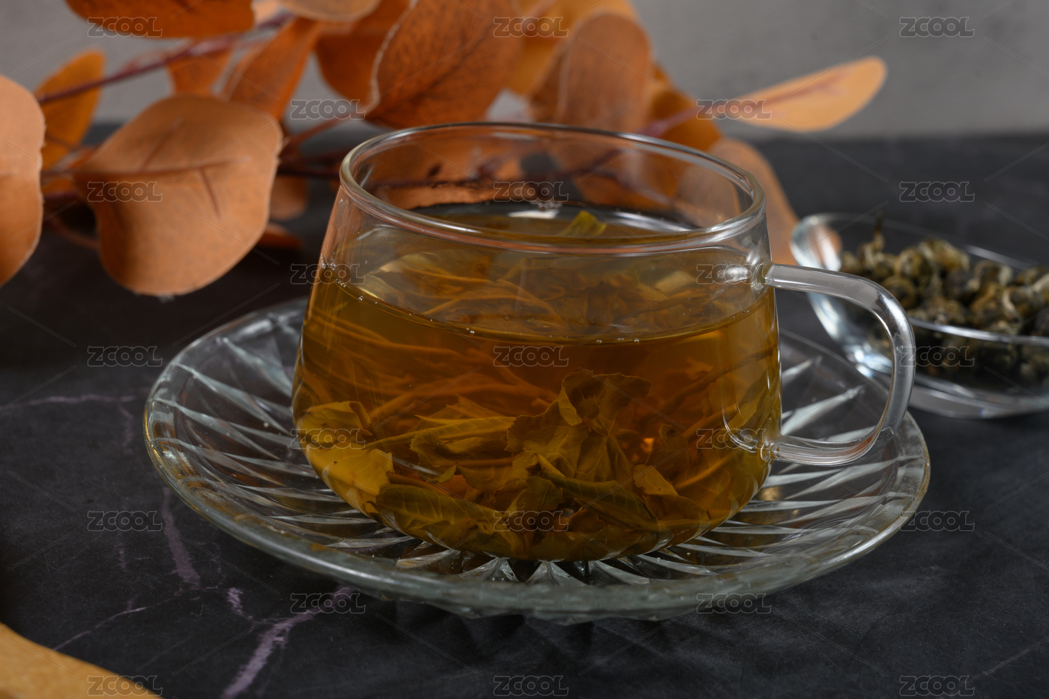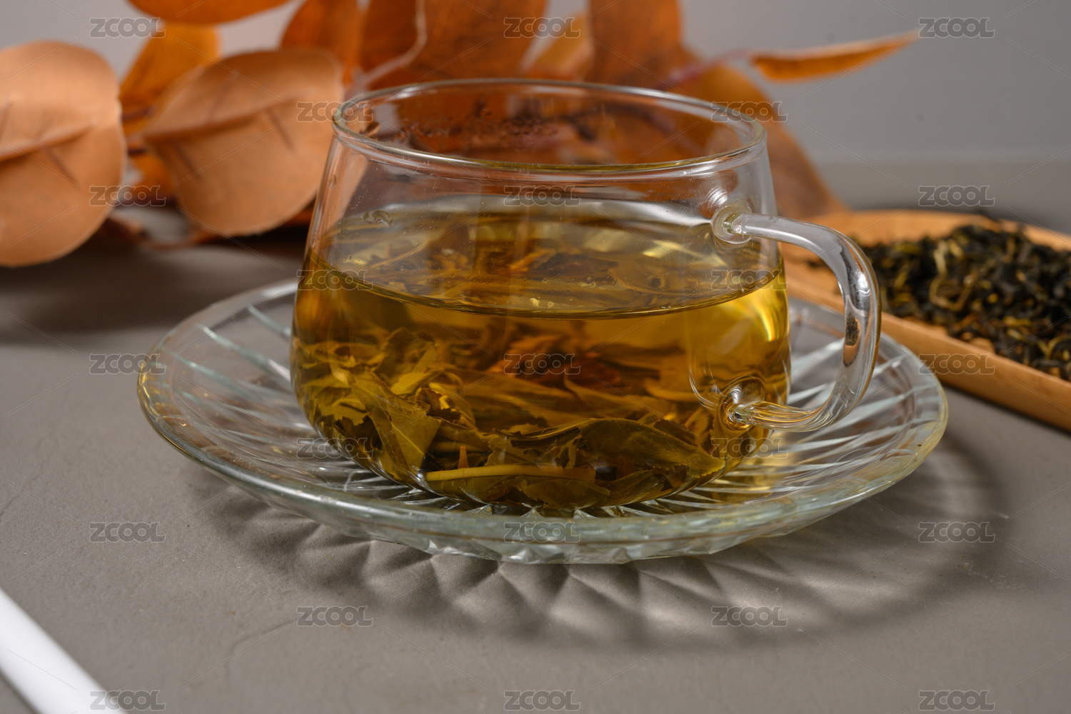 桌面上的杯子里的甘甜可口的茉莉吐珠茶