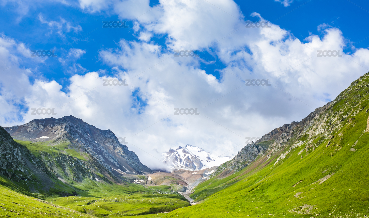 中国新疆夏季蓝天白云下G217独库公路沿途高山草原