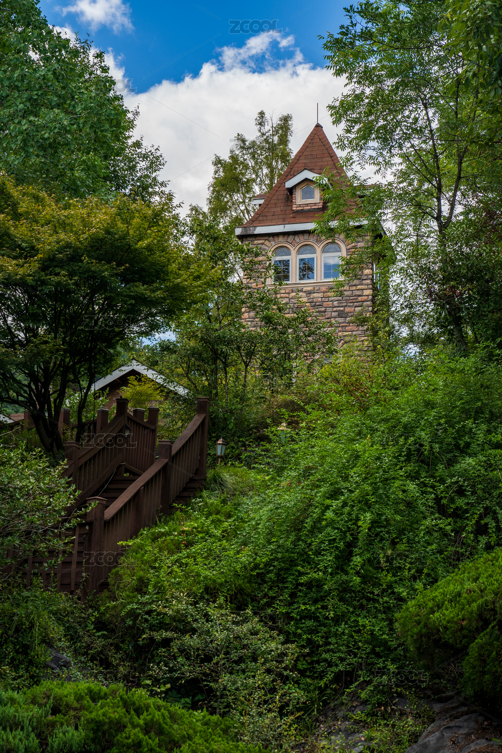 中国哈尔滨秋季晴天太阳岛景区欧式建筑花园