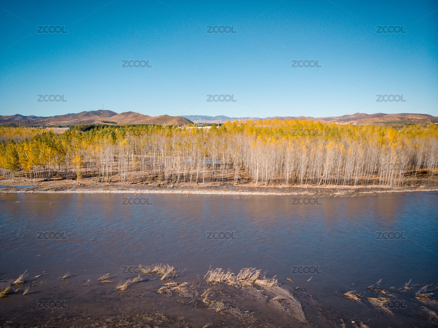 秋天内蒙古赤峰坝上草原的河滩湿地和树林