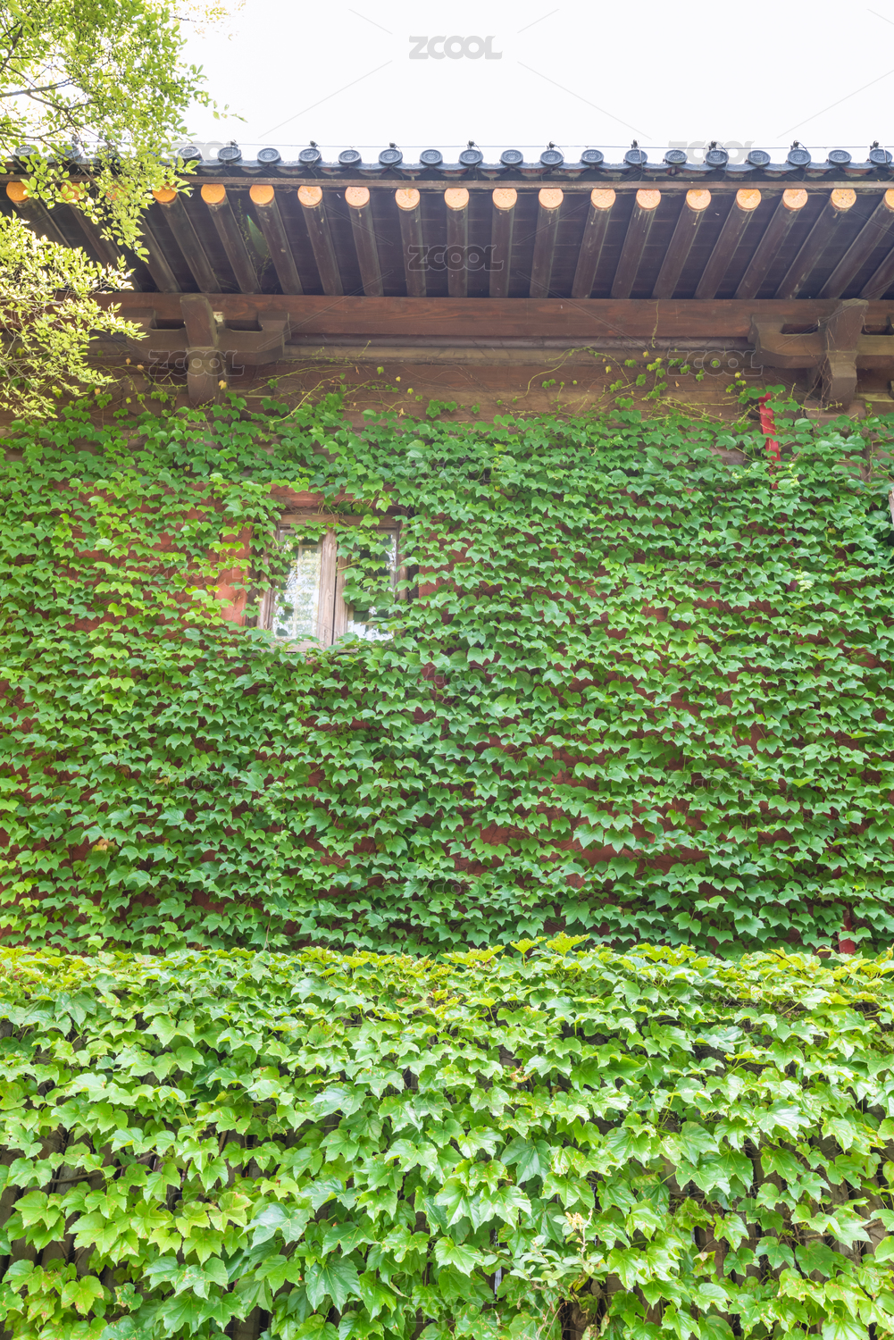 中国上海知也禅寺的寺院红墙古建筑绿藤