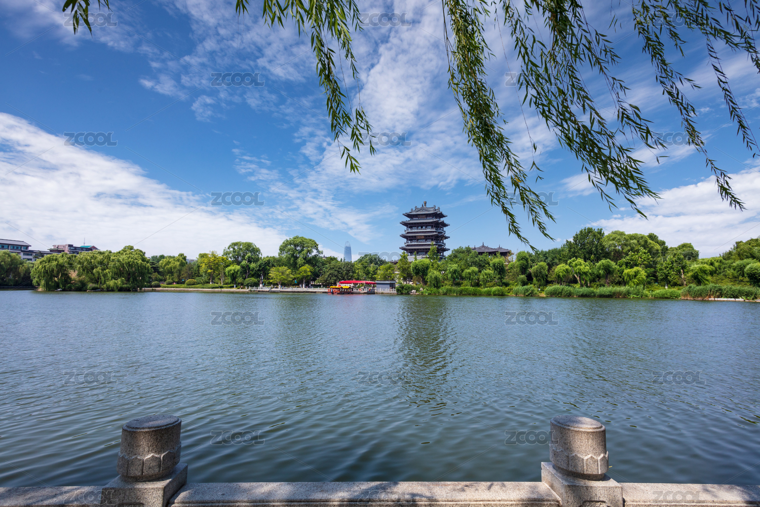 中国,山东,济南,大明湖,夏季,蓝天,白云,平视角,泉城,地标