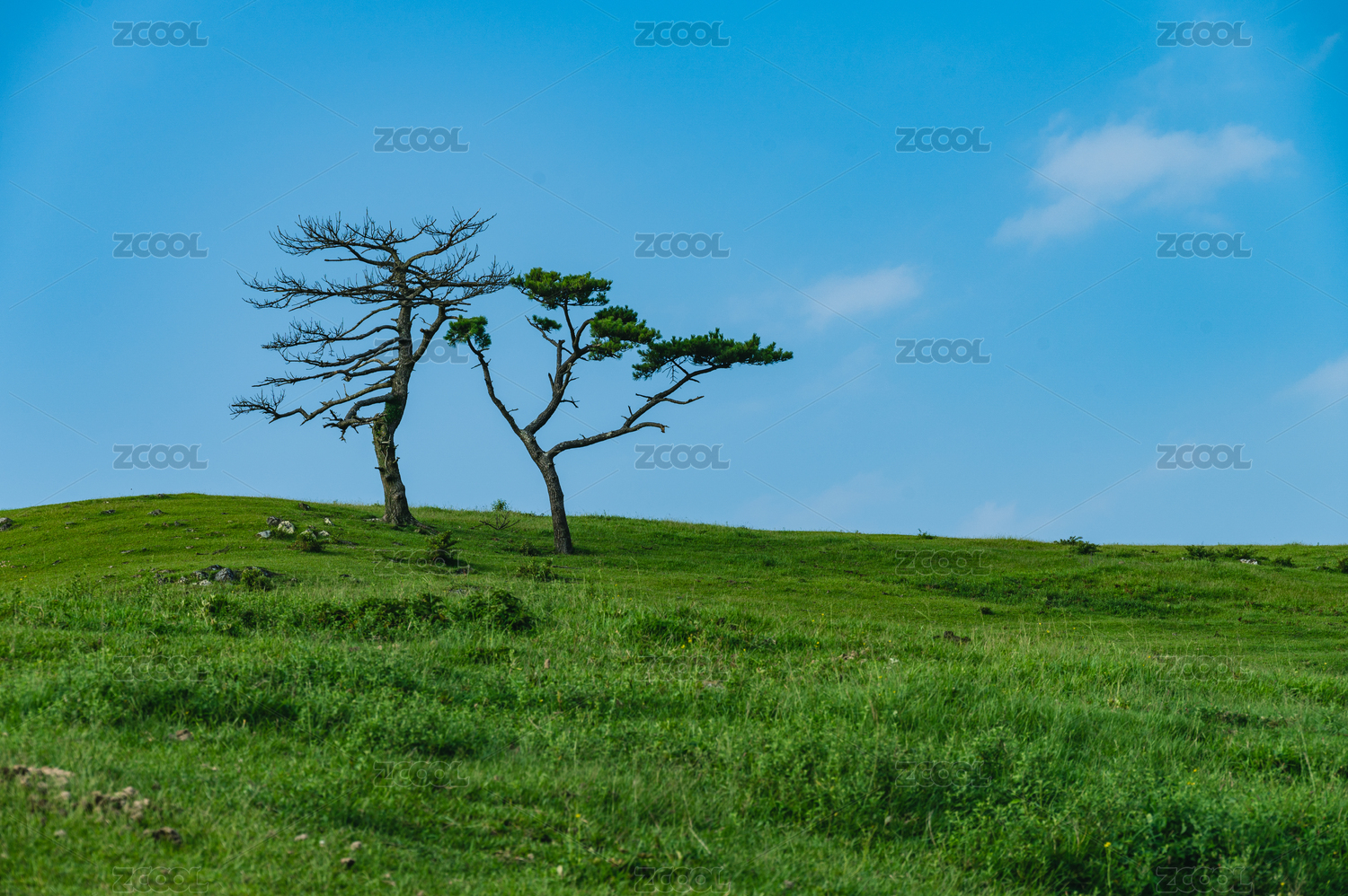 绿色山坡上的一棵大树