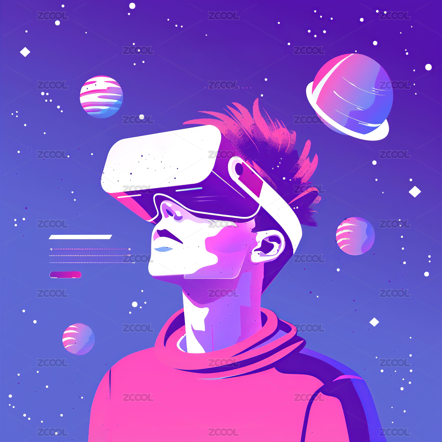 一个头戴VR眼镜的女生在充满科技感的宇宙
