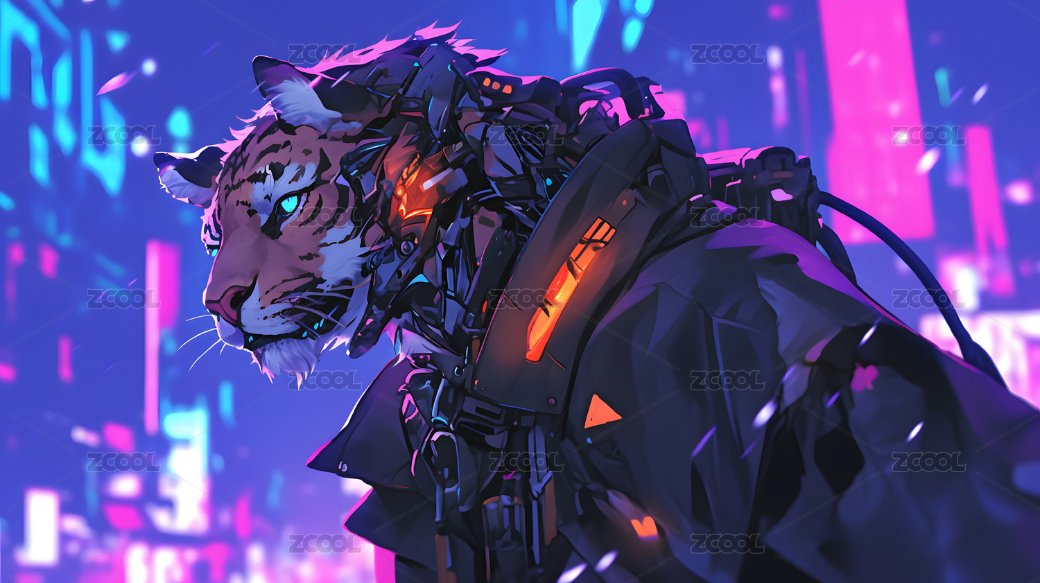 蓝紫色渐变赛博风格调色,狗戴墨镜炫酷插画