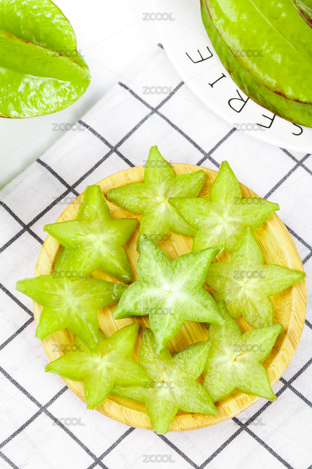 清新背景上放着一盘红龙杨桃和杨桃果肉