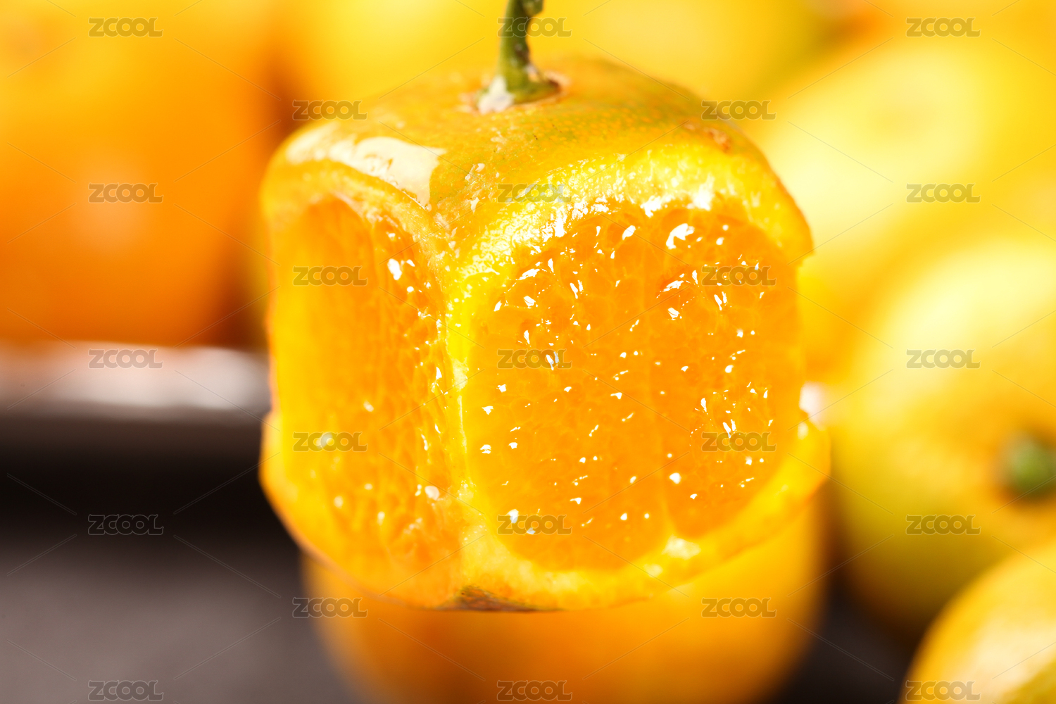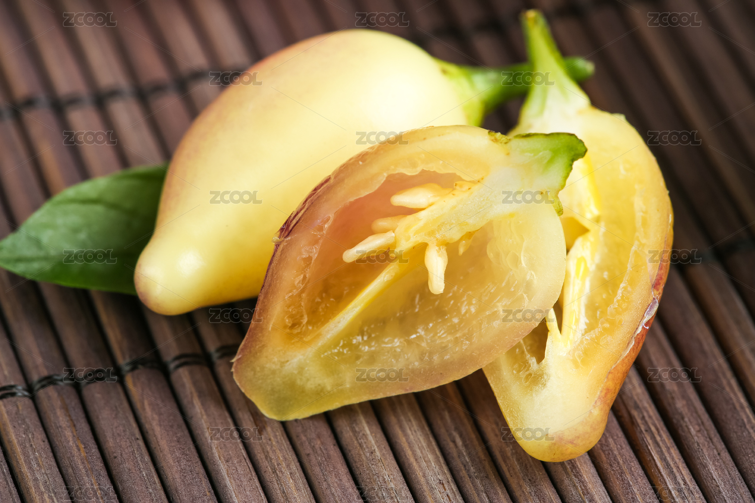 一堆新鲜黄色小番茄和一个咬过的小番茄