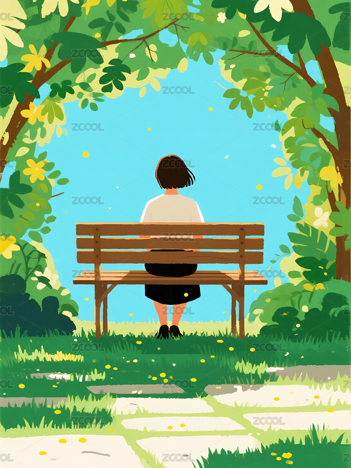 公园长椅少女远望树荫风景