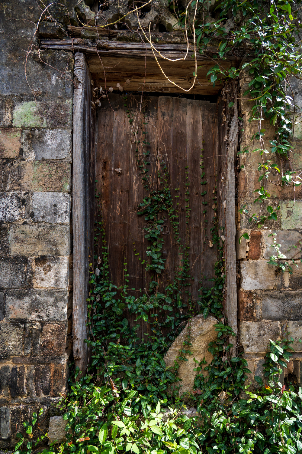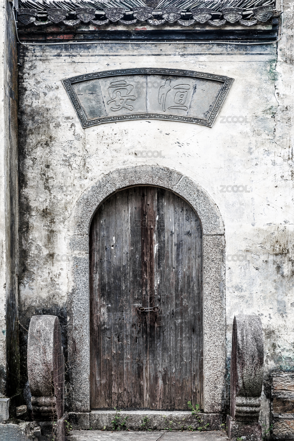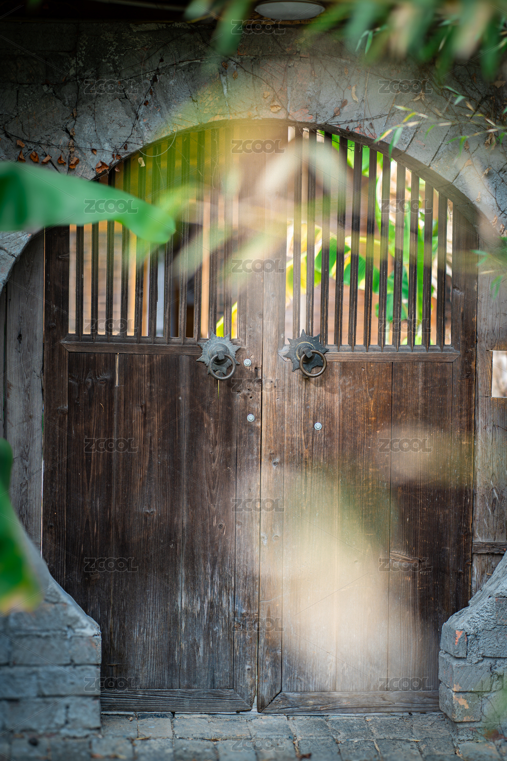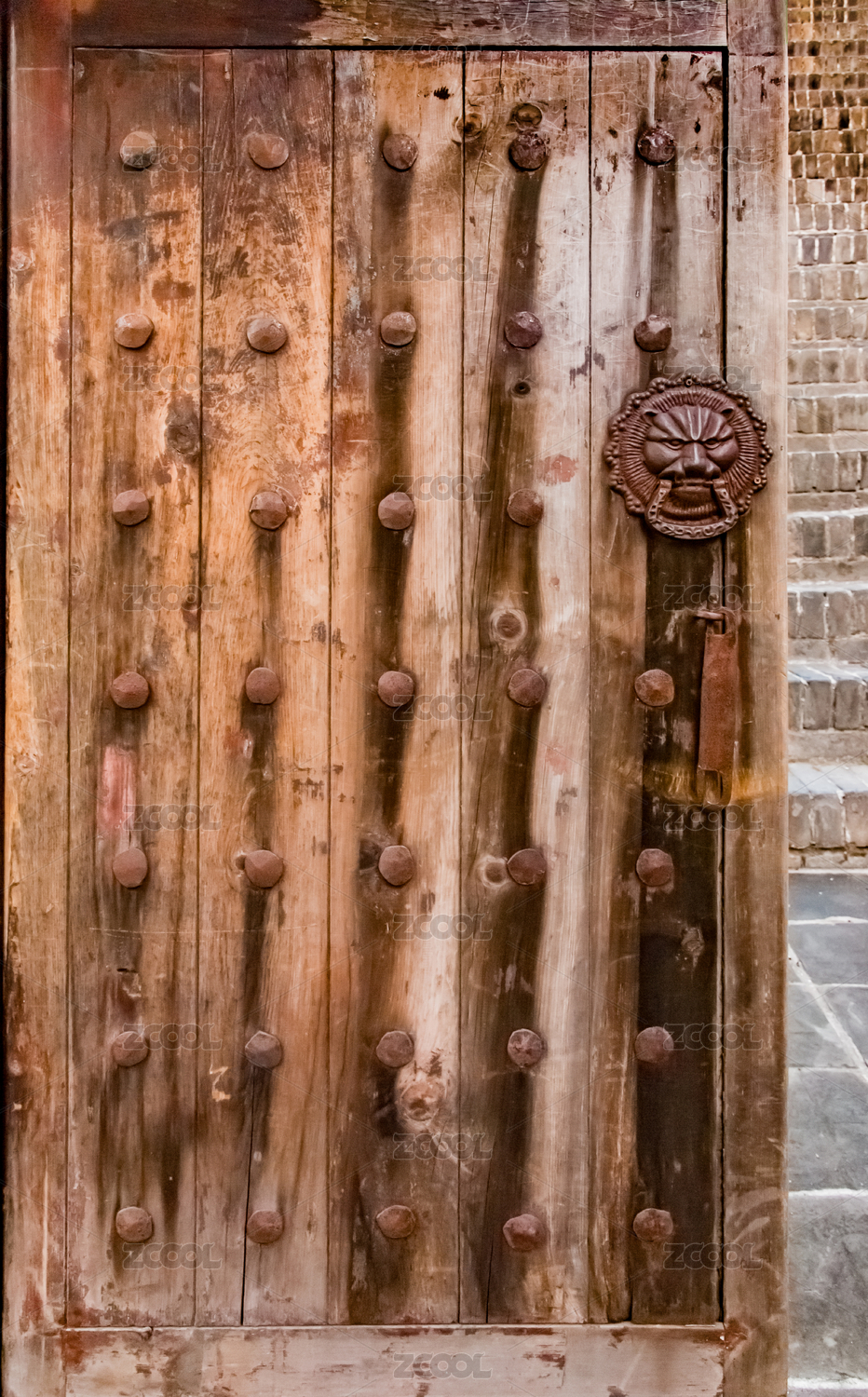 中国古建筑上紧闭的古代红木门上的门环门钹