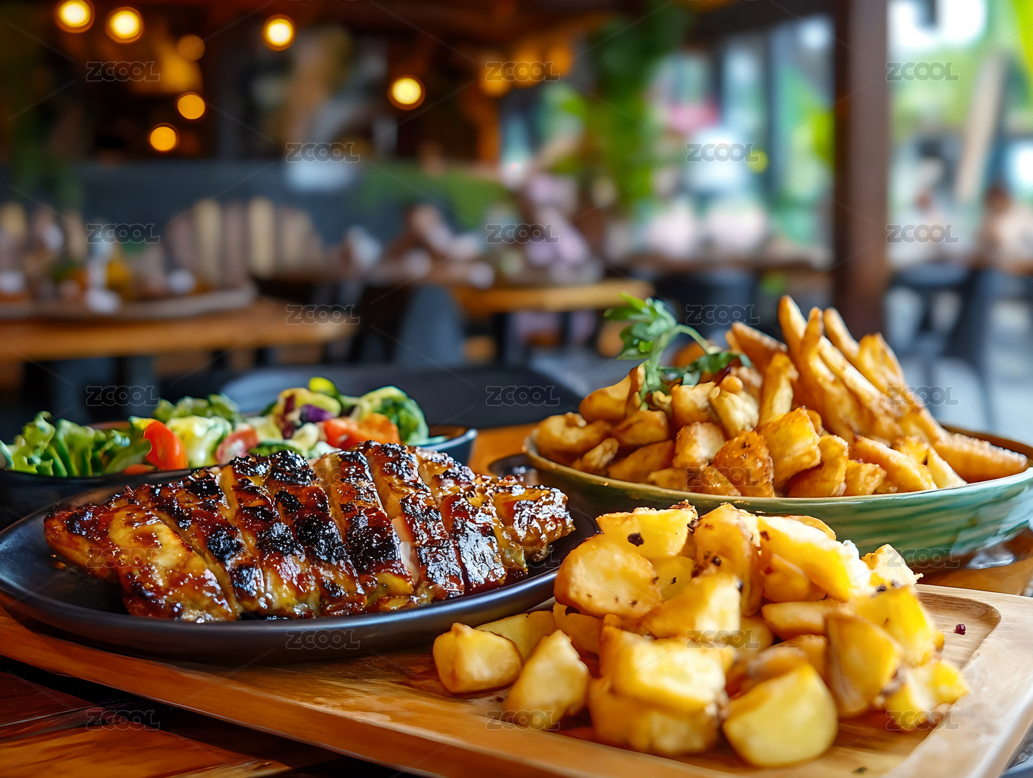 木托盘上烤牛排盐焗龙虾配薯条特写