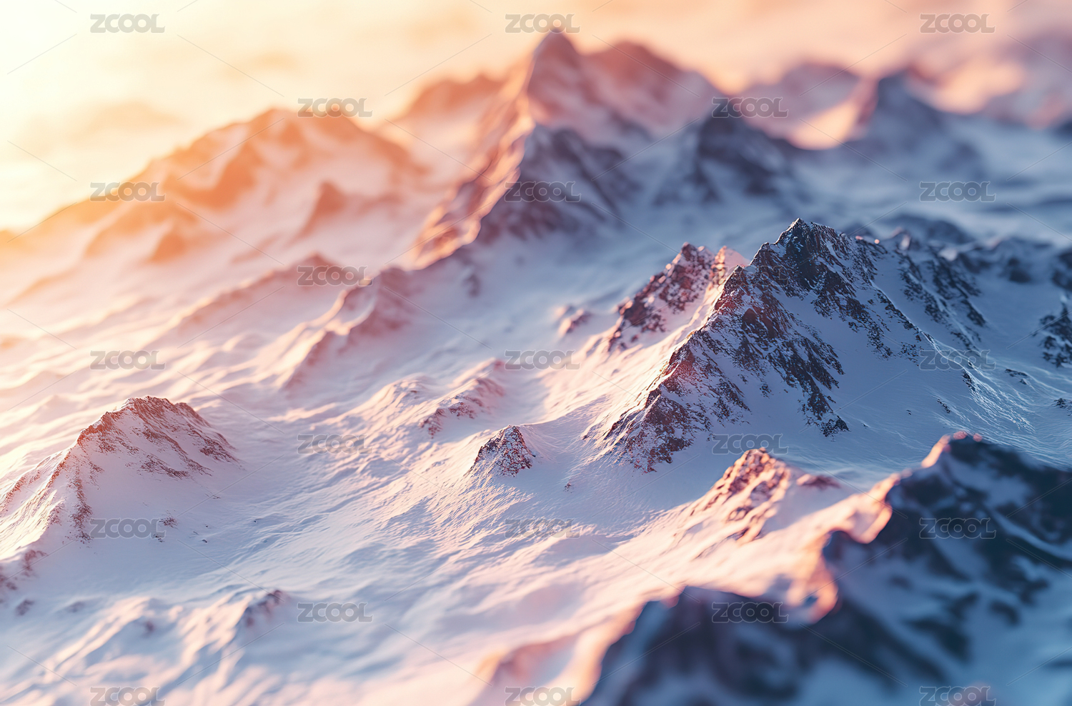 日落时白雪皑皑的群山景色