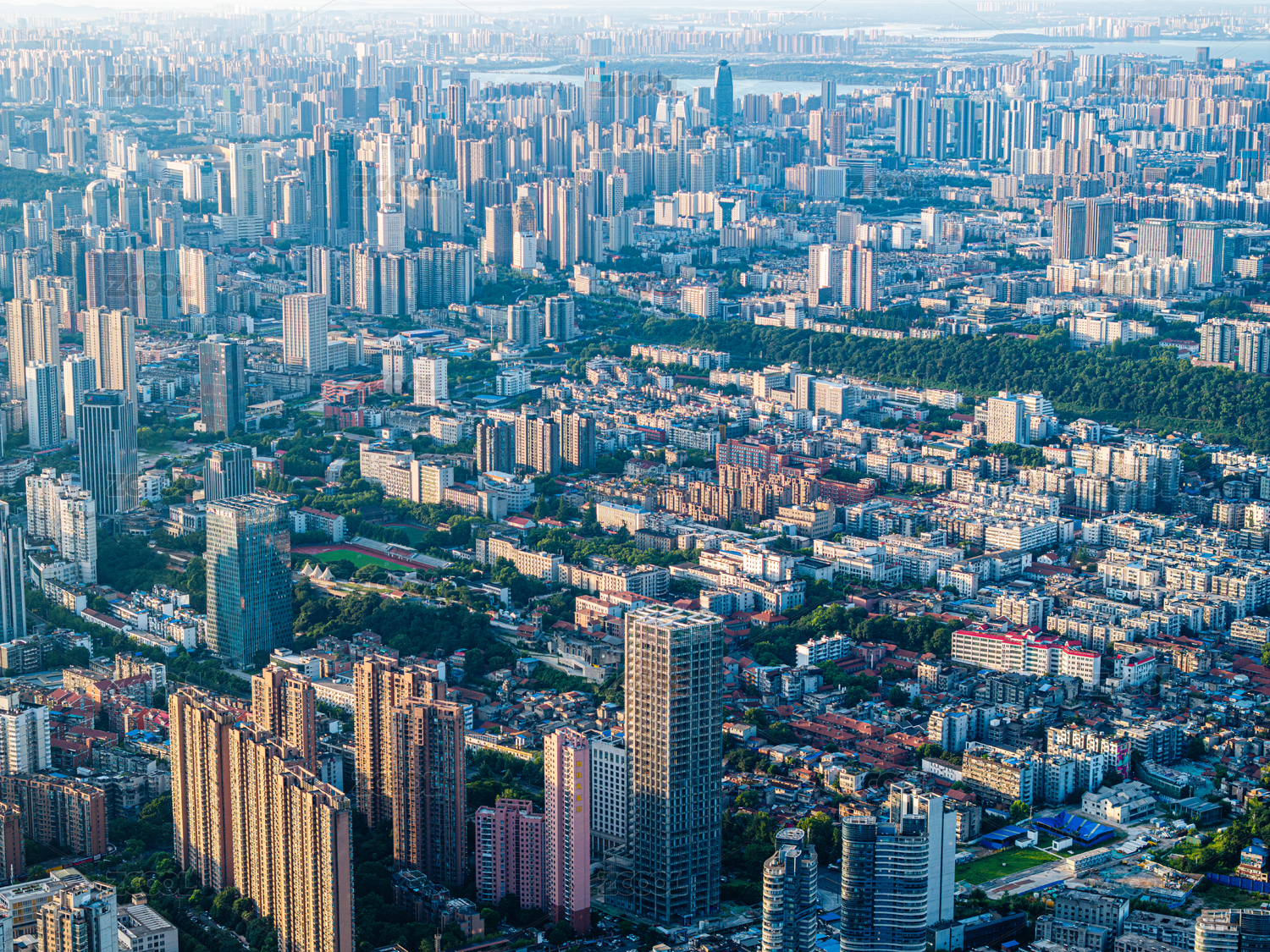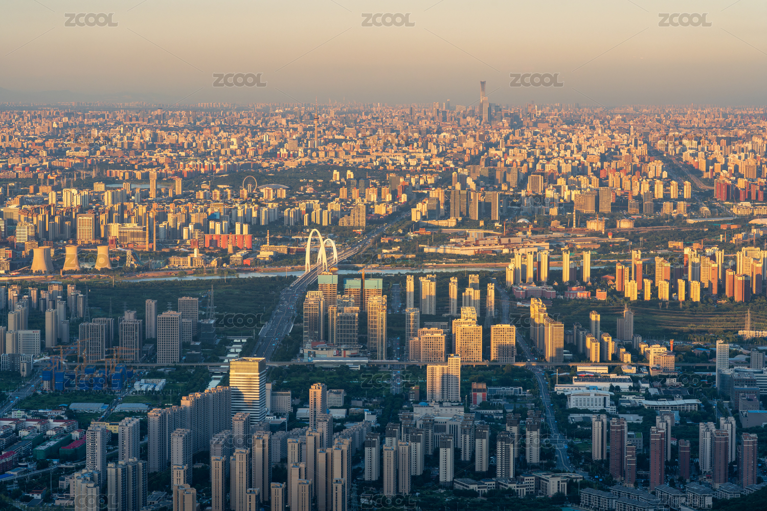 俯瞰黄昏金光中的北京繁华城市密集建筑群