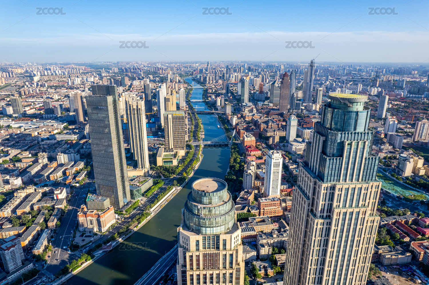 天津海河直沽桥沿岸小白楼商圈城市日落风光
