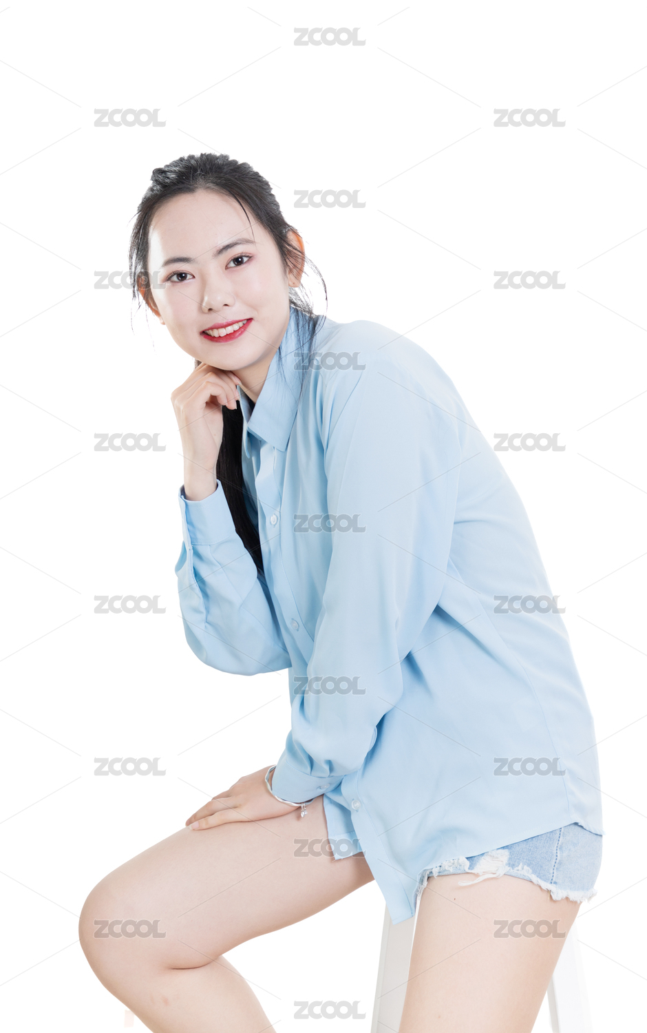 女孩,女性,白色背景,蓝色衬衣,衬衫,坐,凳子,马尾,长发,短裤