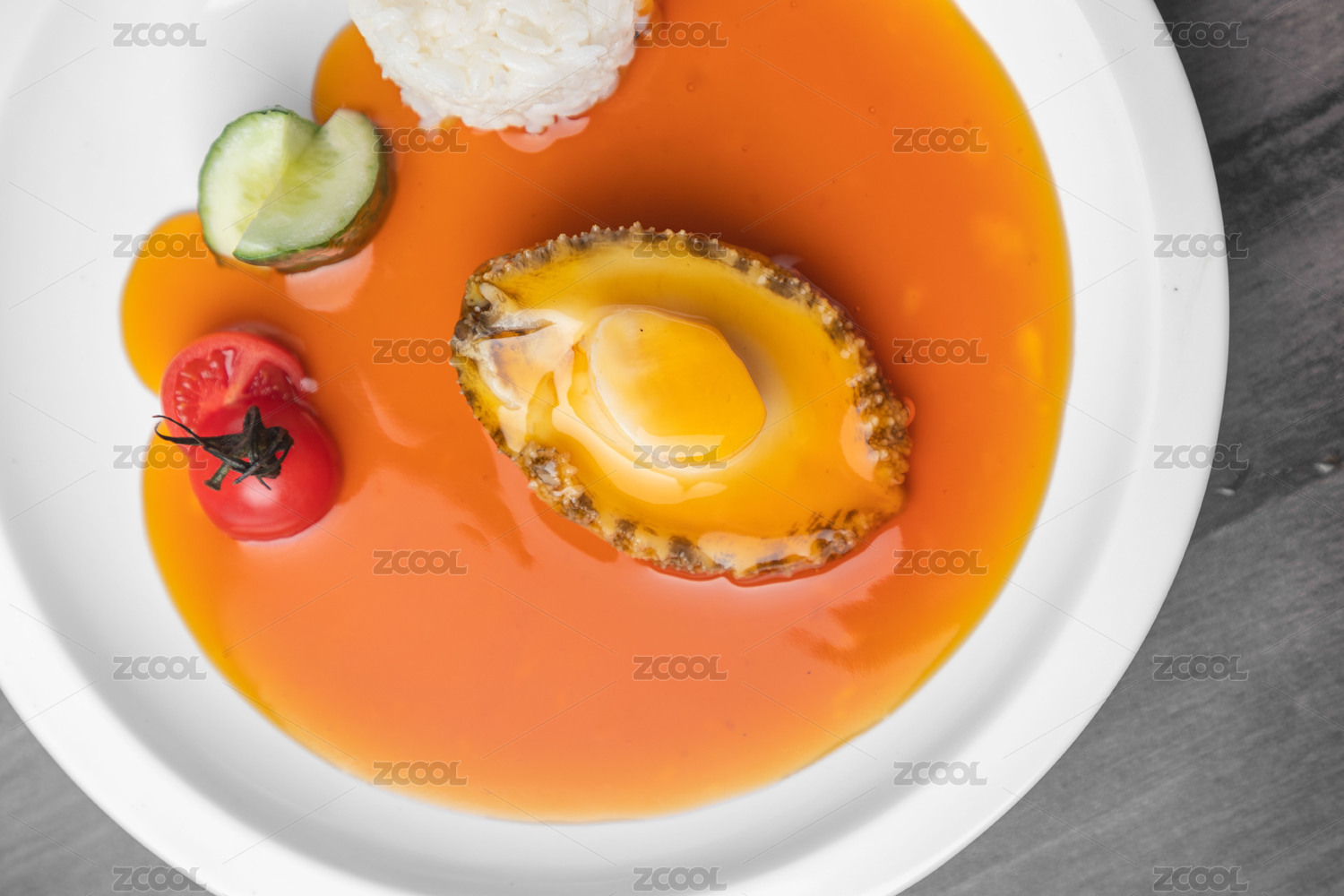 棕色木纹桌面上放着一碗鲍鱼捞饭