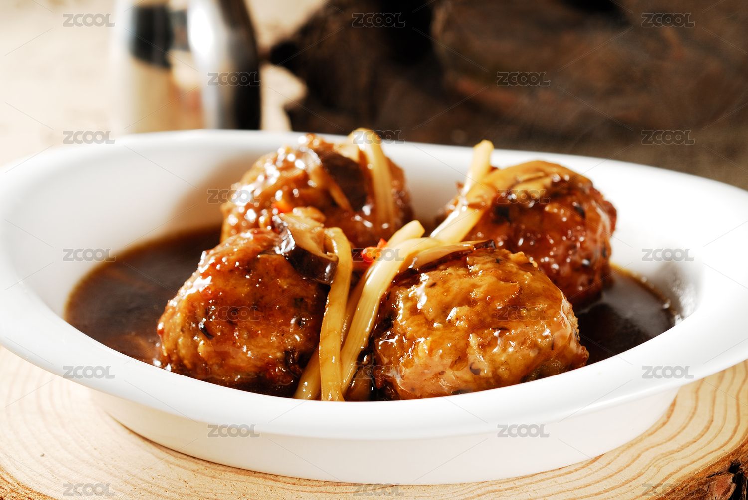 餐桌上陶瓷盘子里的浇汁肉丸特写