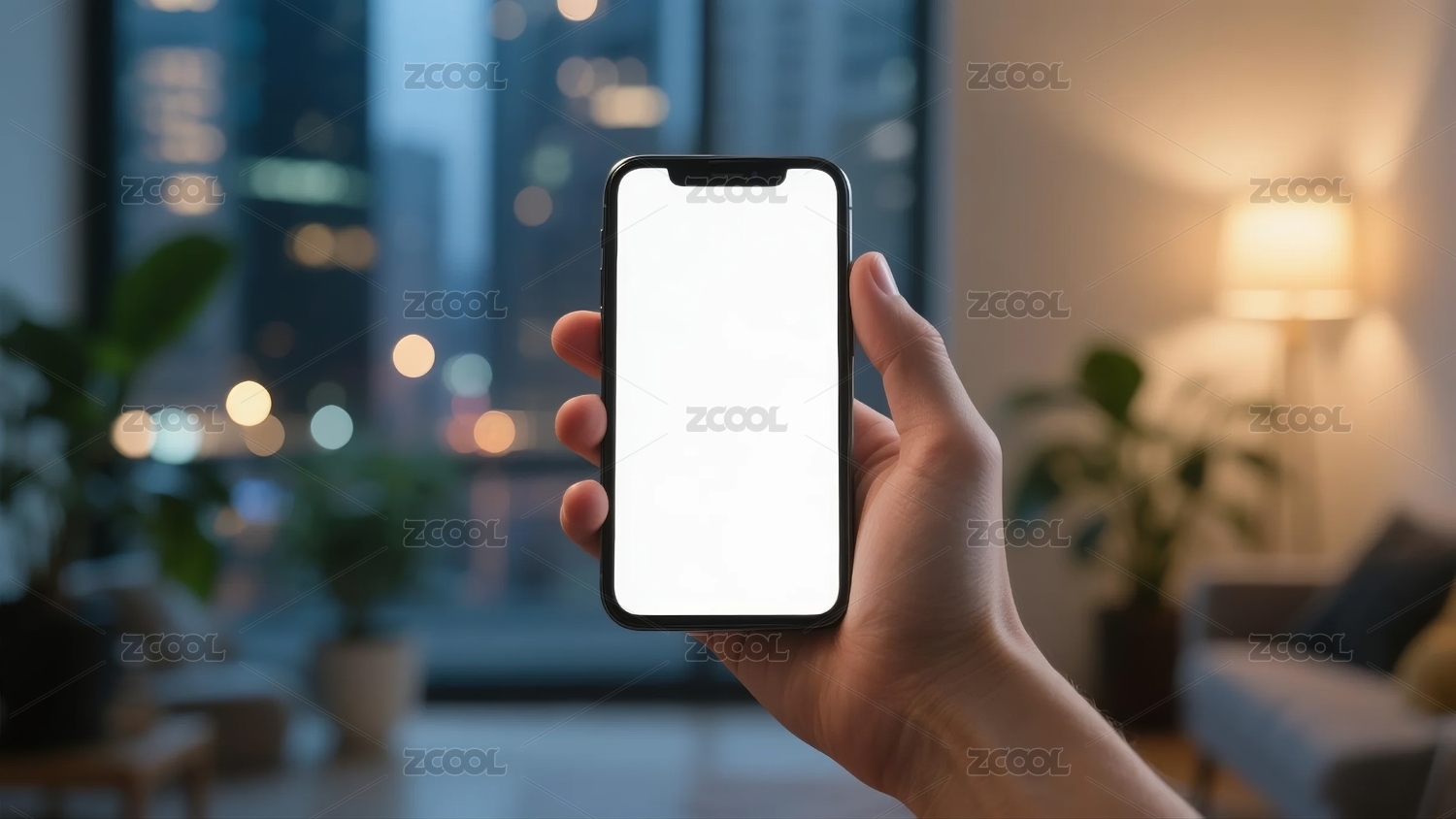 夜晚一只手拿着绿色空白屏幕的智能手机