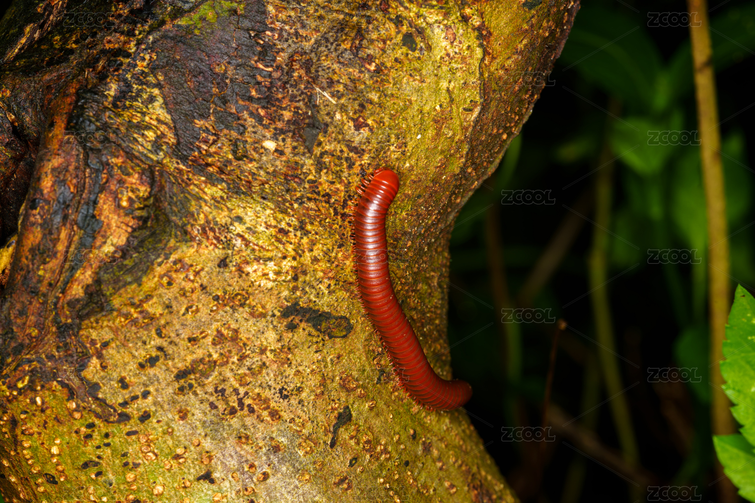 树干上的红色千足虫