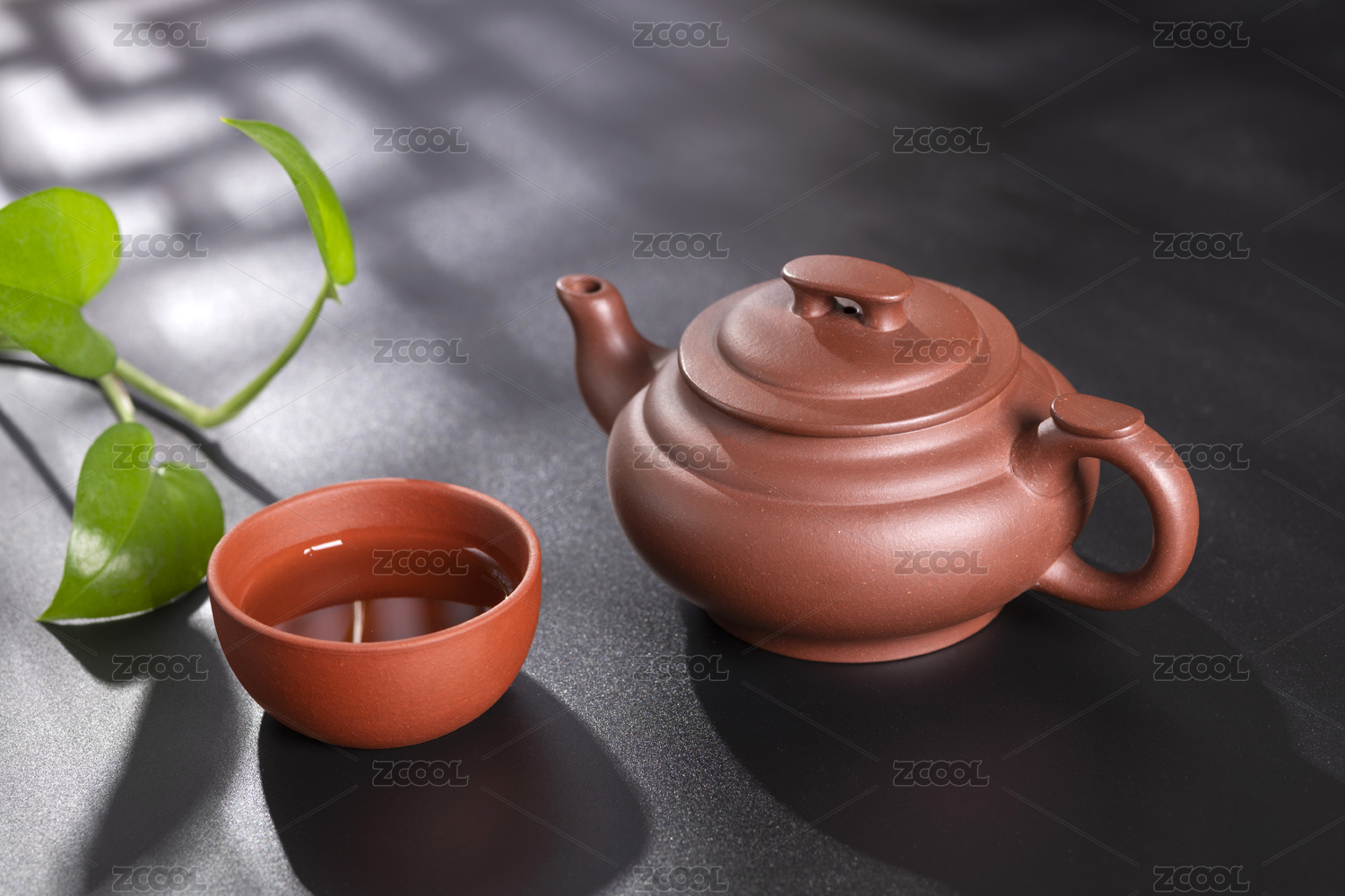 窗影下的黑色桌面上摆放着传统茶具紫砂壶及紫砂杯