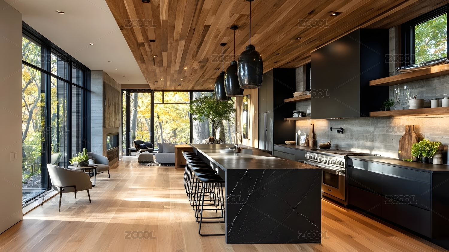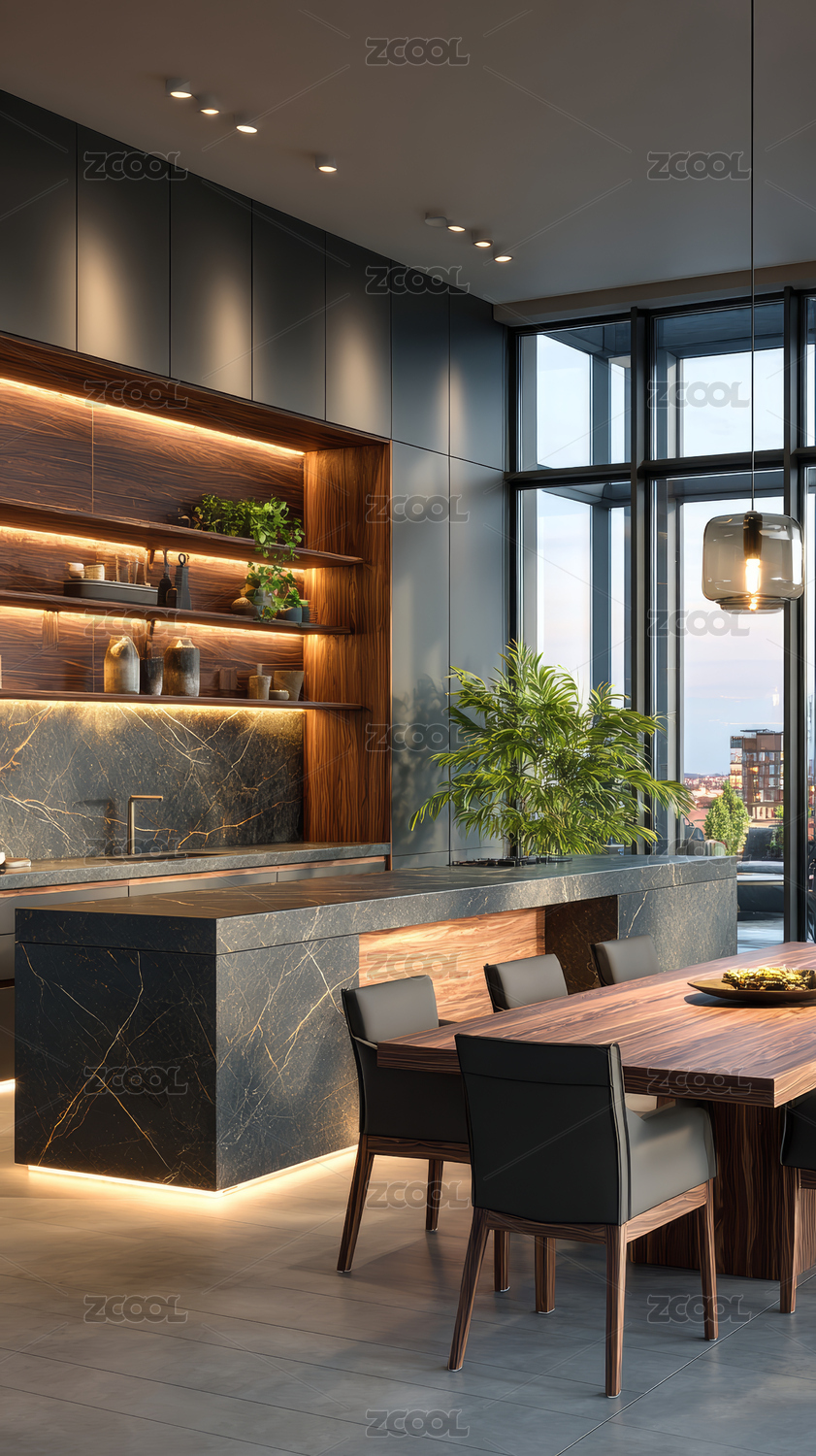 现代原木风极简现代餐厅厨房吧台场景