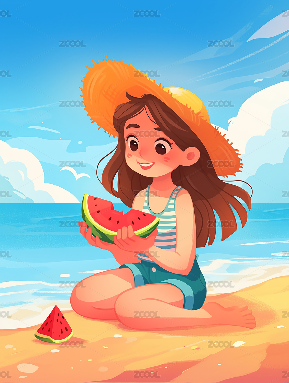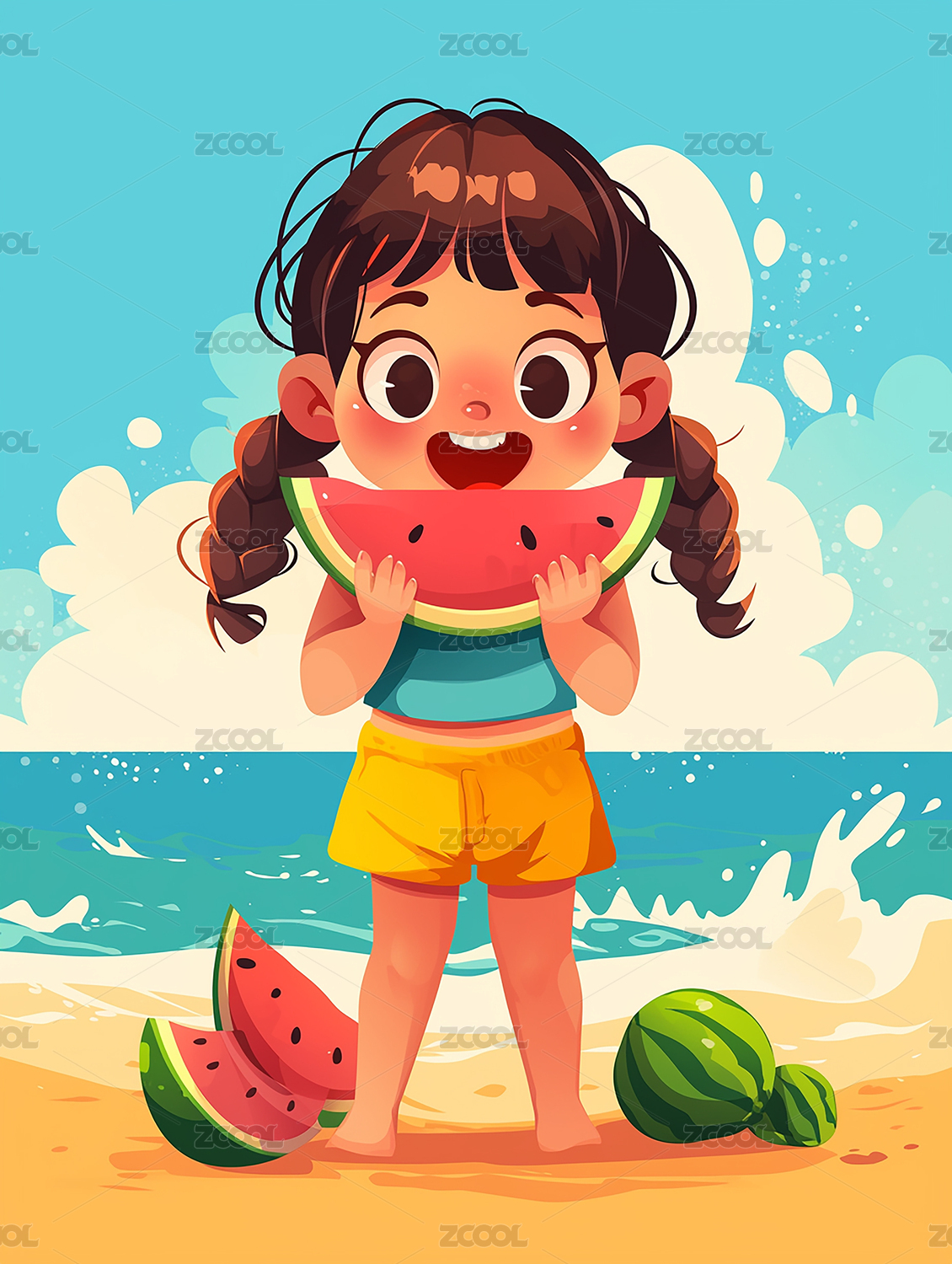 乘凉,吃西瓜,处暑,大暑,儿童,风景,节气,节日,解暑,卡通
