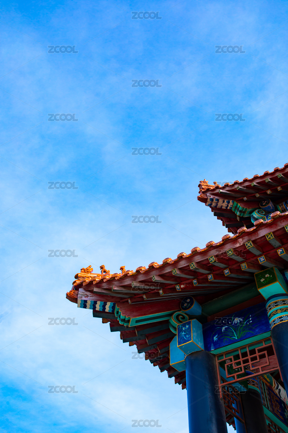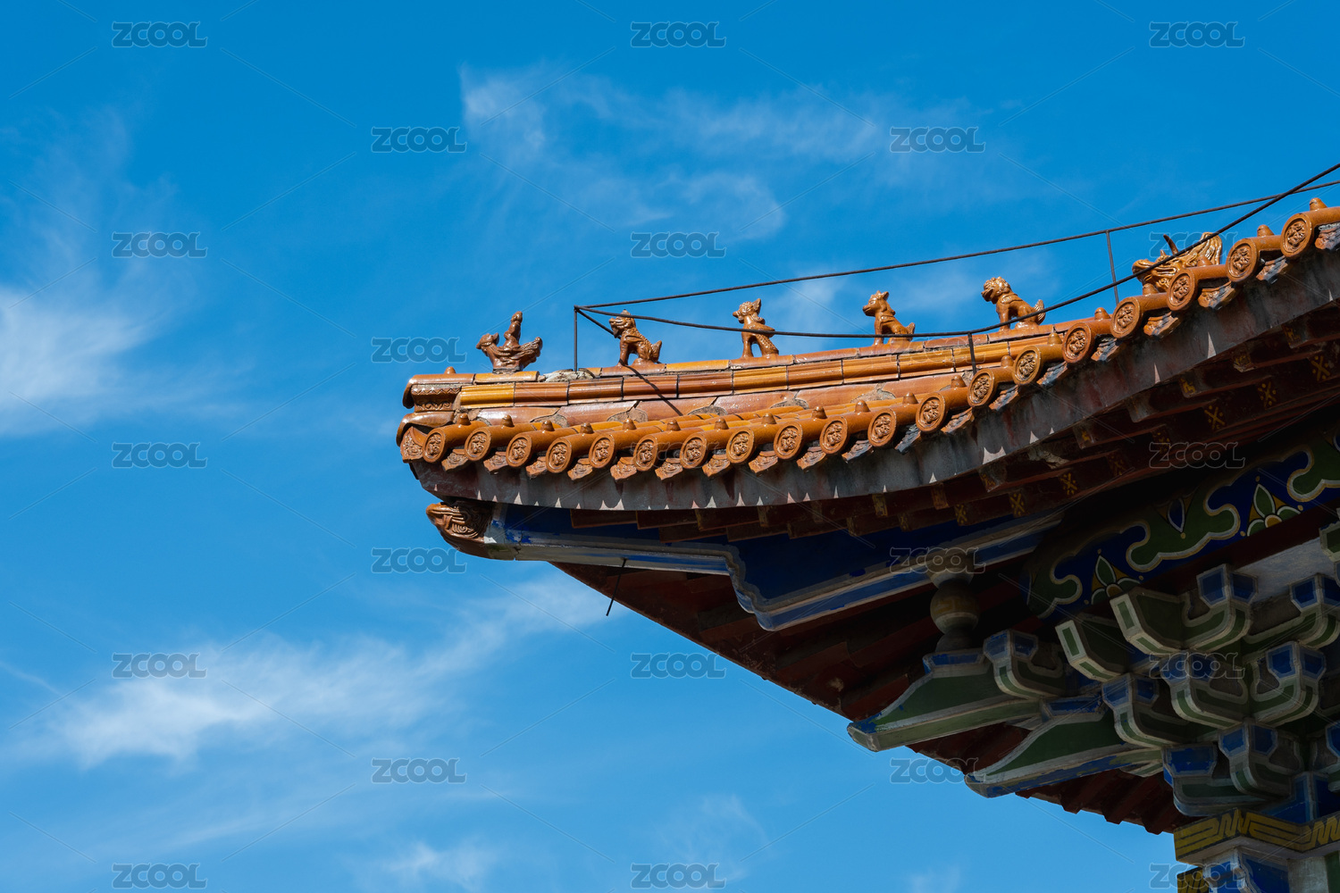蓝天下的北京中山公园宰牲亭屋顶房檐特写