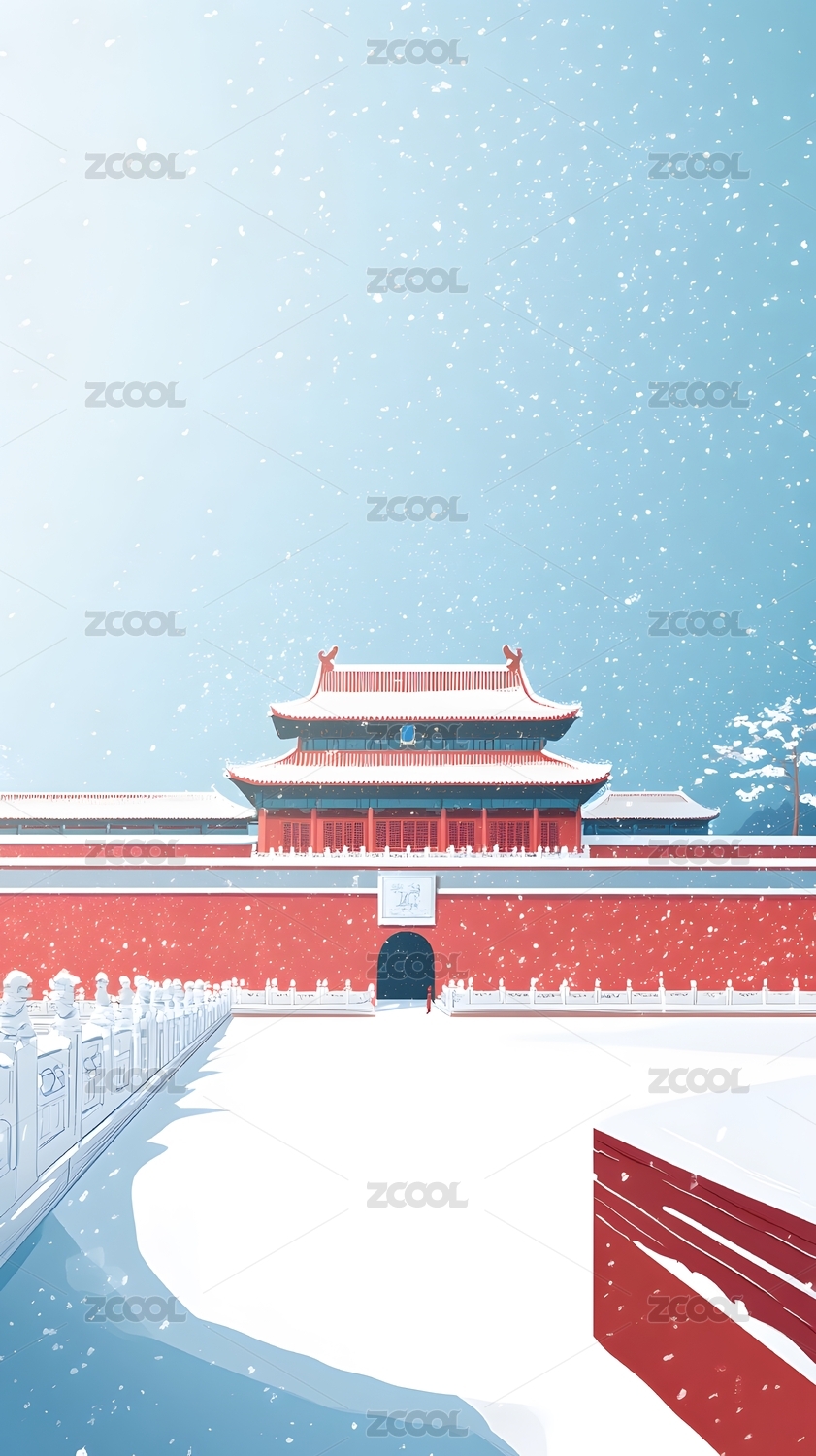 故宫,雪景,飞鹤,冬季,宫殿,红墙,白雪,水墨画,中国风,古建筑
