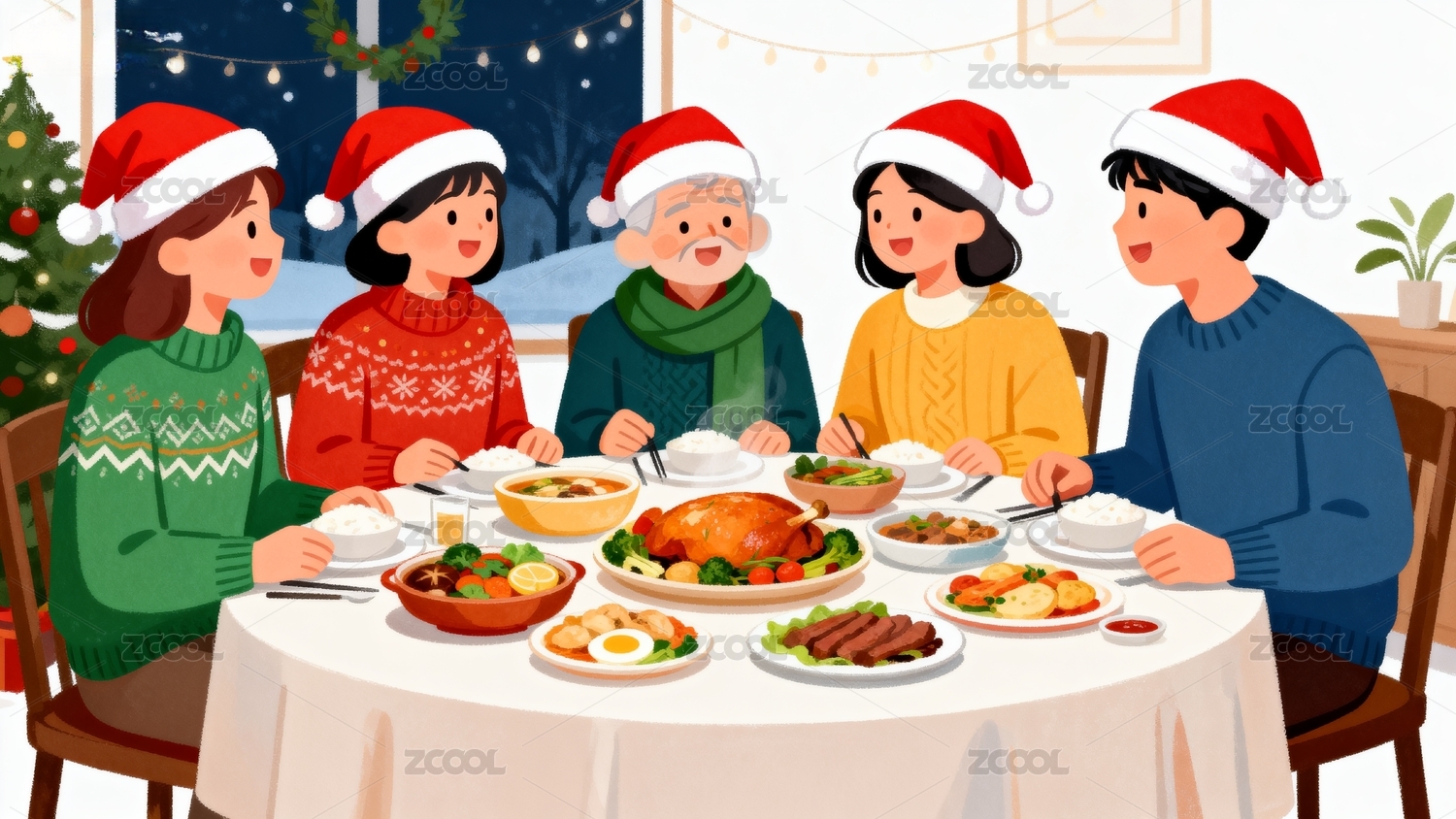 一桌丰盛的中国菜传统晚宴的中国风喜庆插画