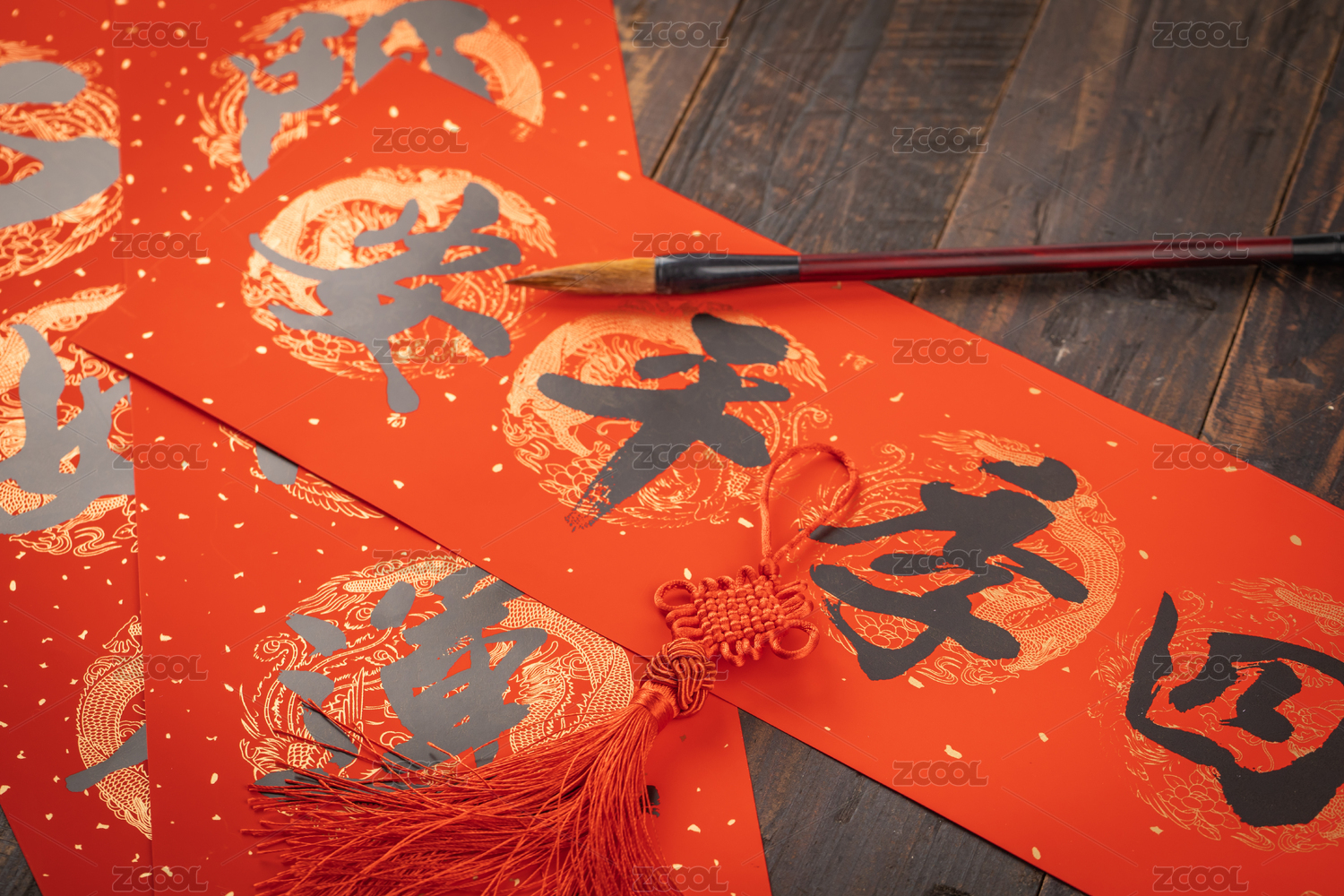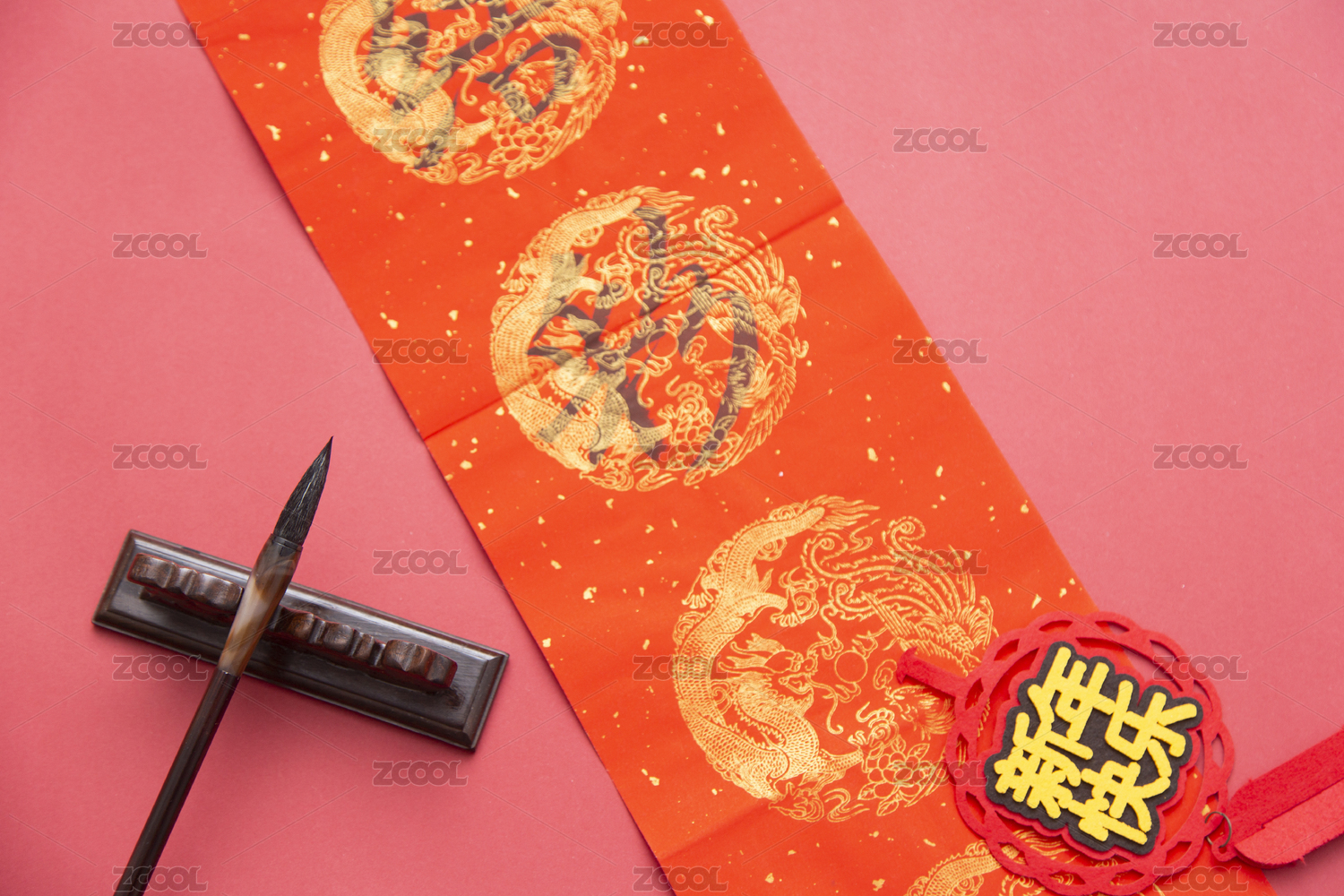 毛笔放在春联和福字背景上