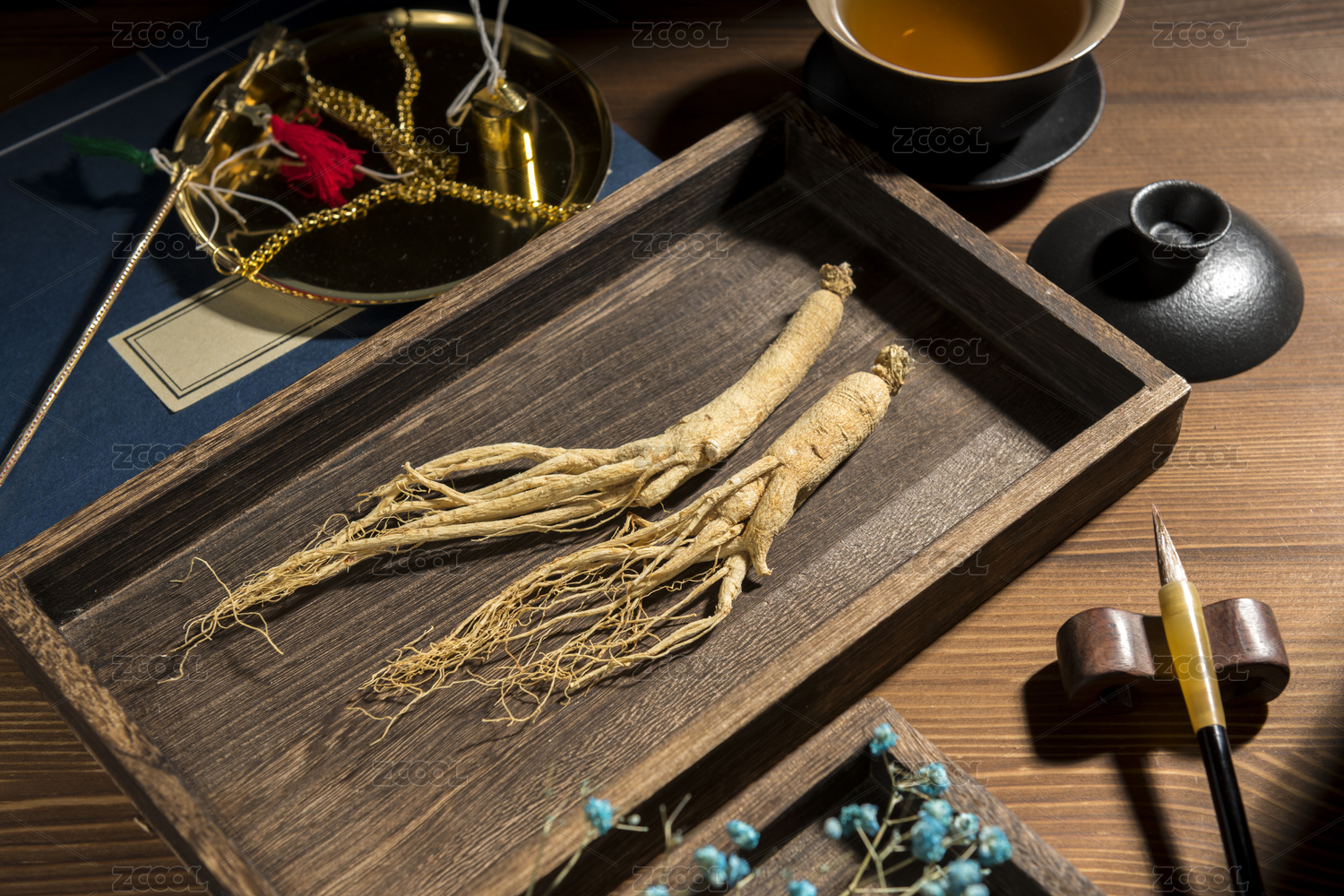 名贵滋补中药材人参摆放桌面上特写