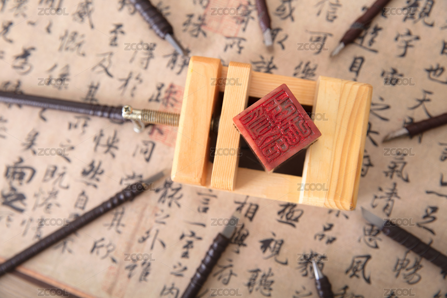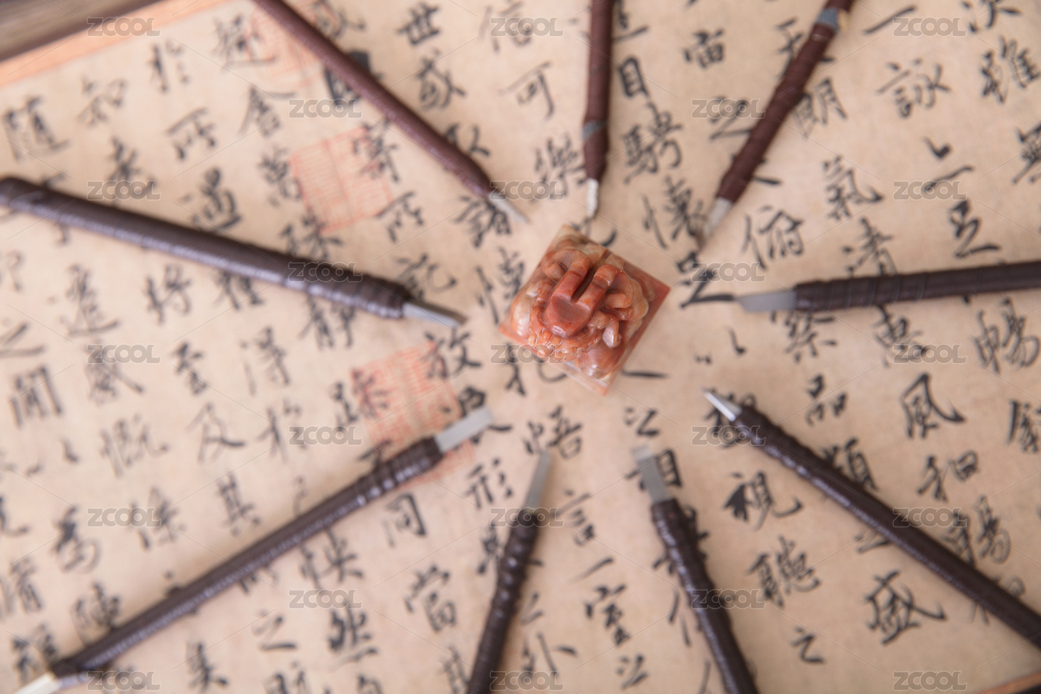 俯视拍摄书法作品上一枚被众多刻刀围绕的印章