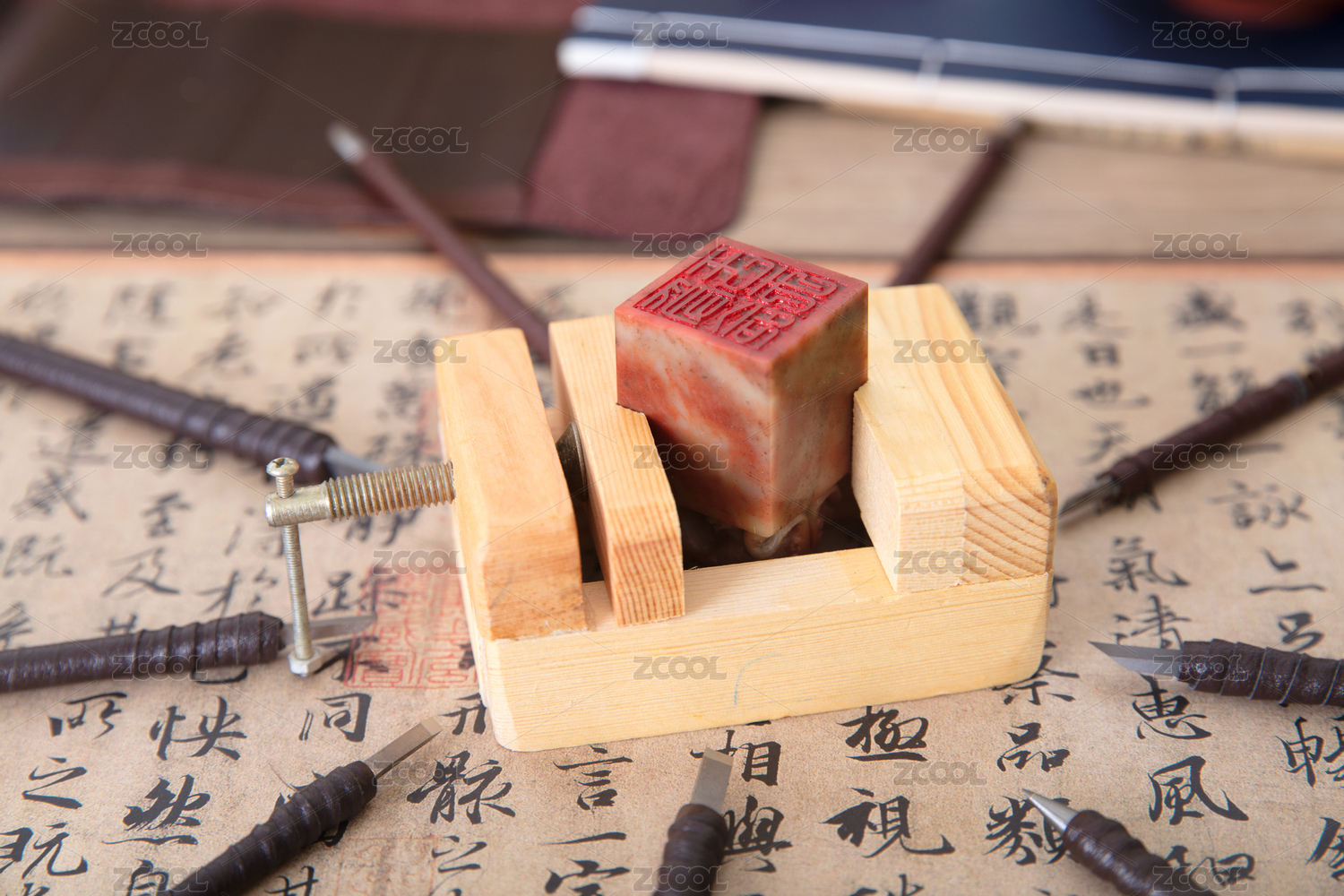 书法背景上固定着空白印章石料的刻床