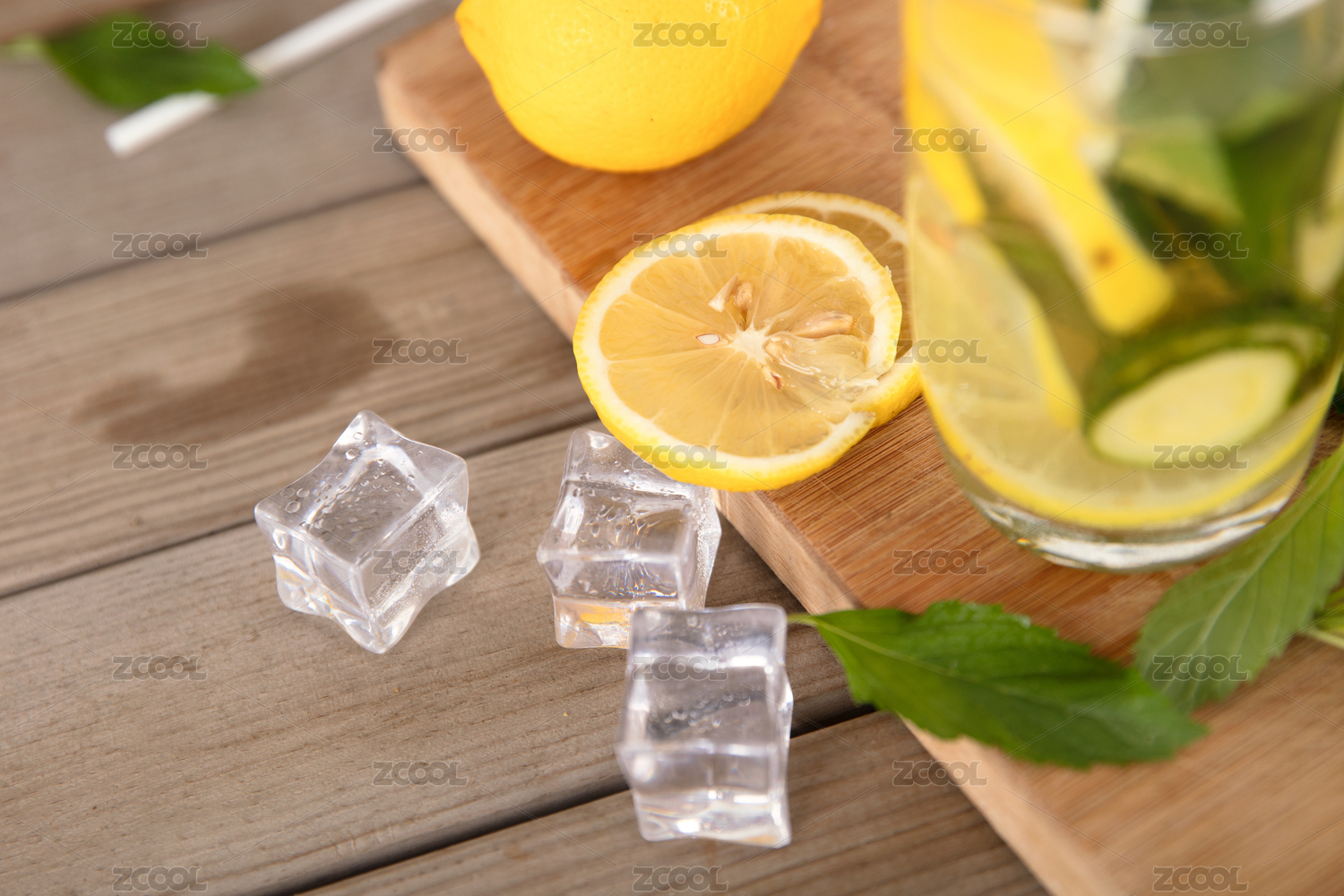 砧板上一杯柠檬黄瓜水和新鲜的柠檬果及冰块和薄荷叶