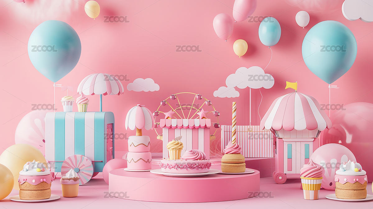 粉色梦幻蛋糕与热气球场景