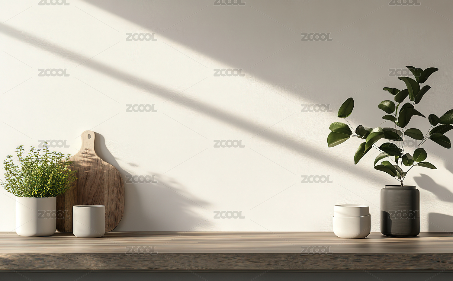 浅色墙面木架绿植光影简约空间