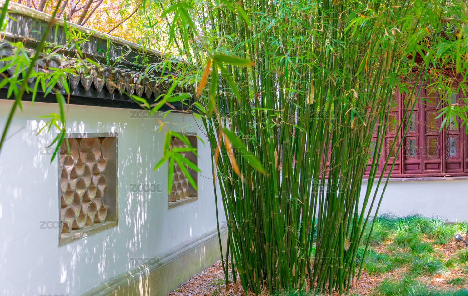 中国江苏省南京市莫愁湖公园竹林后的白墙灰瓦园林墙