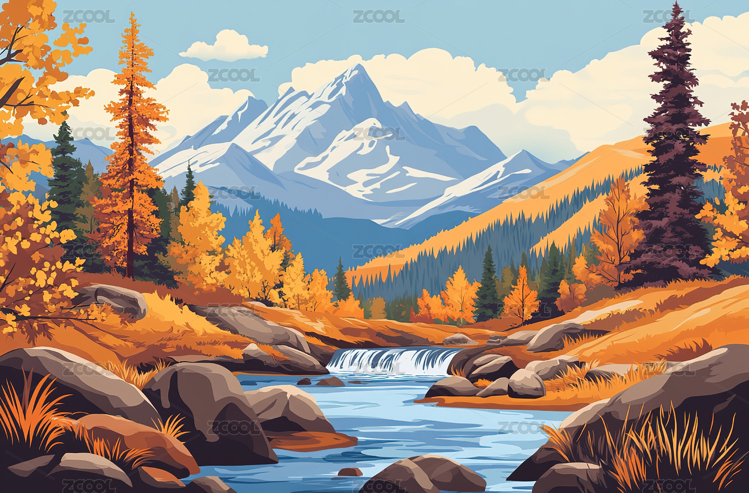 秋山河谷风景插画