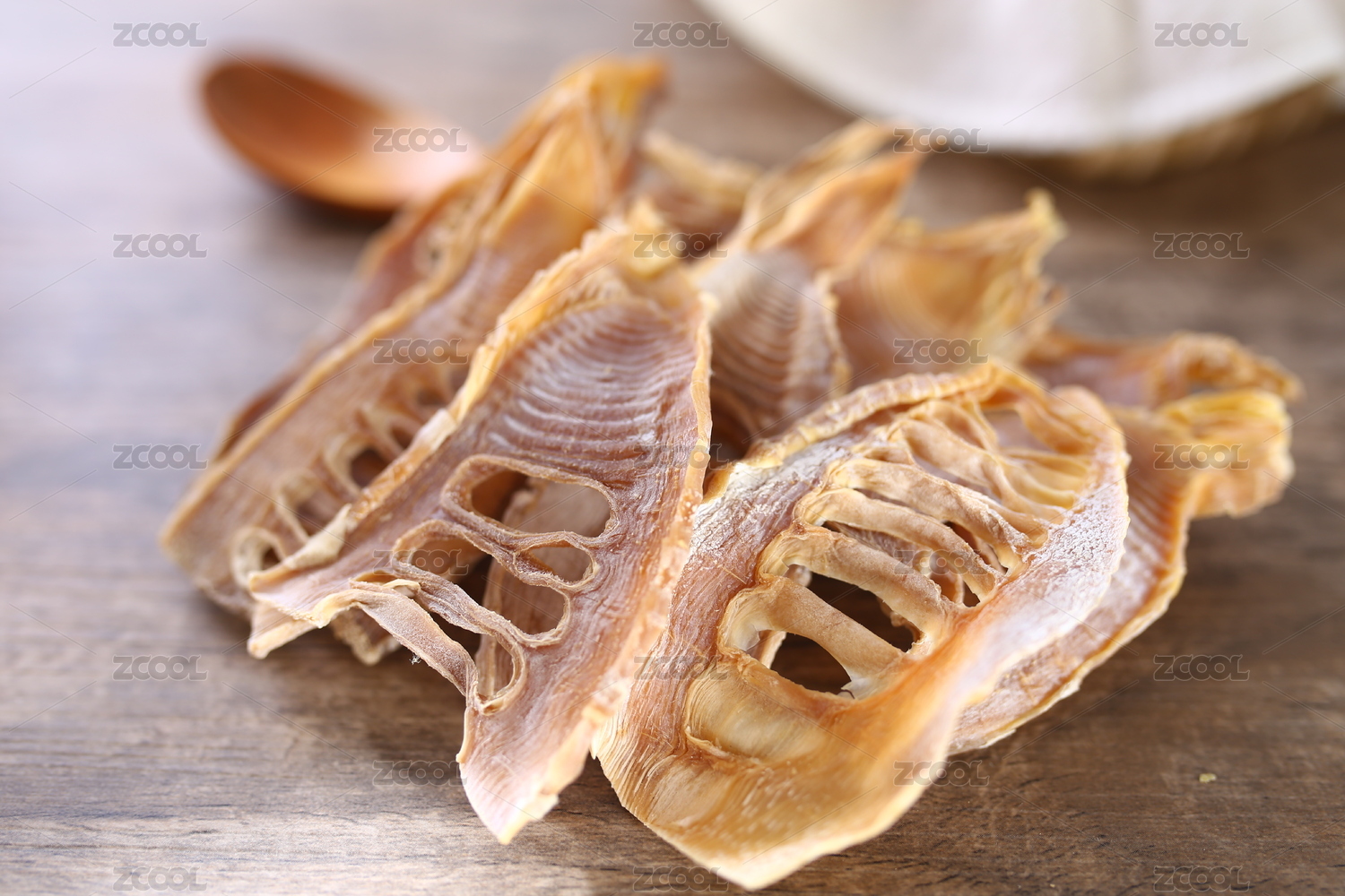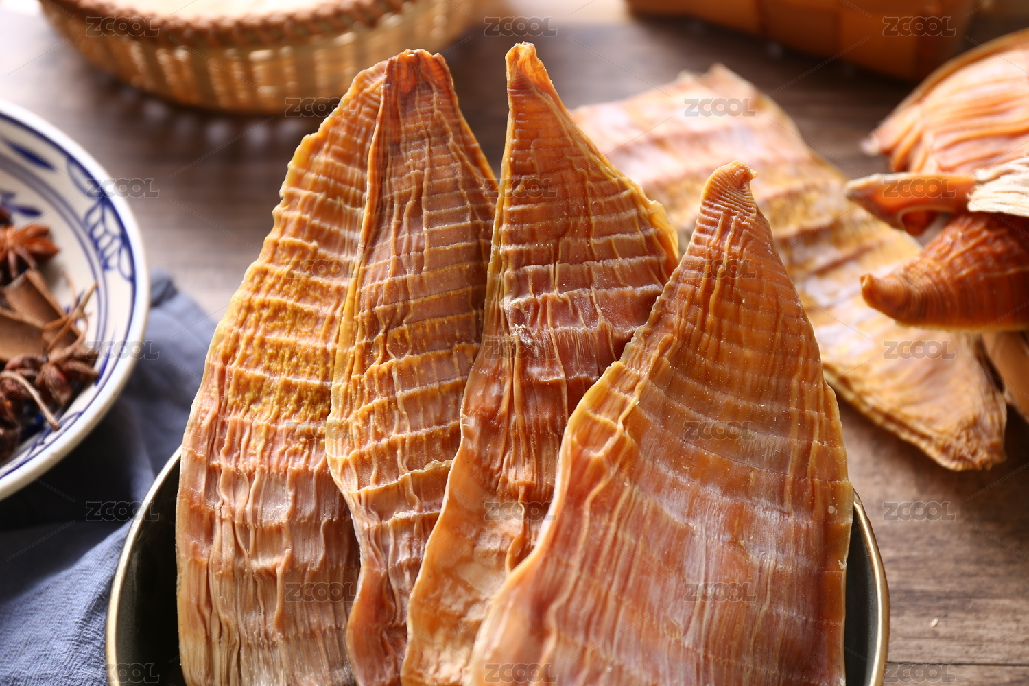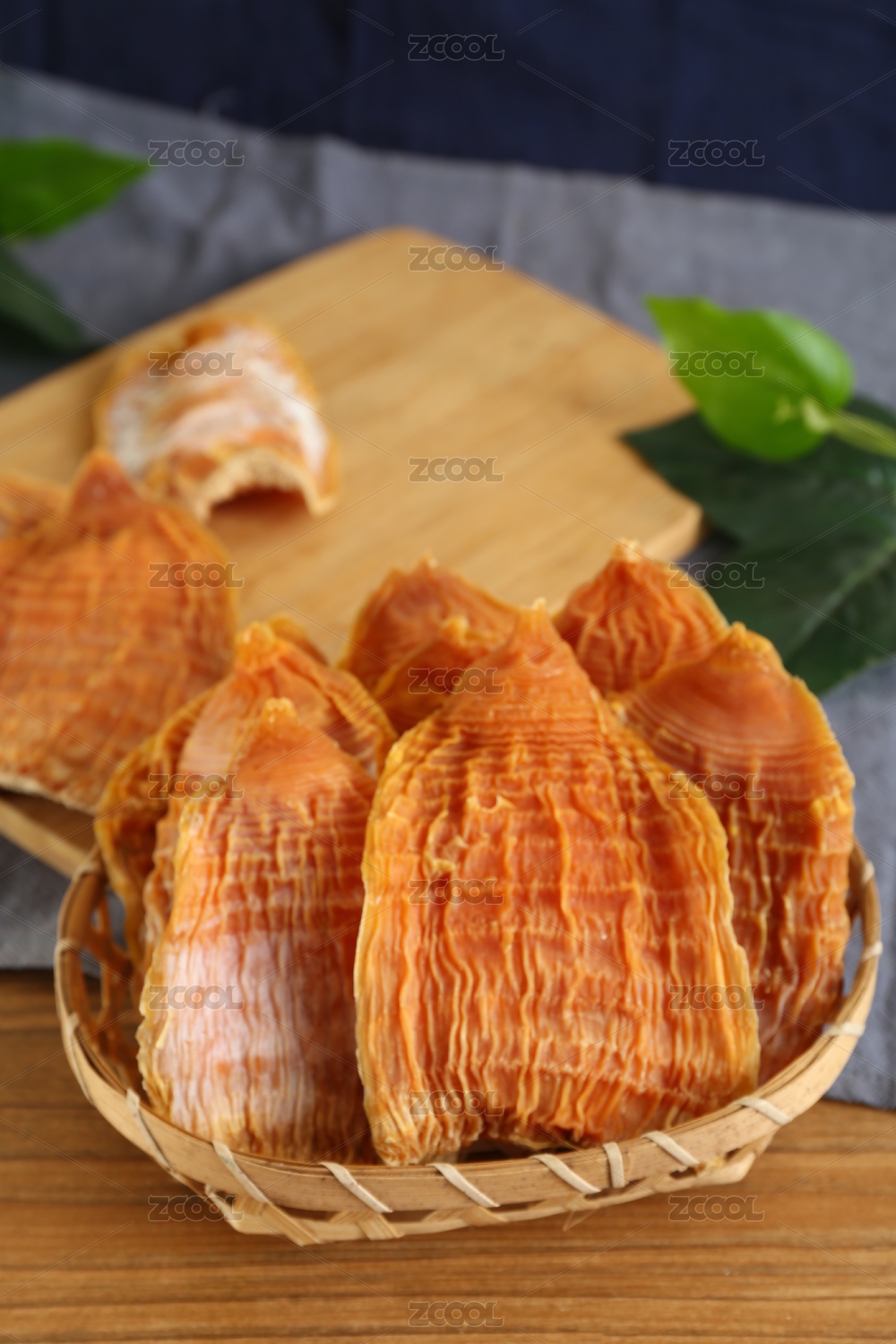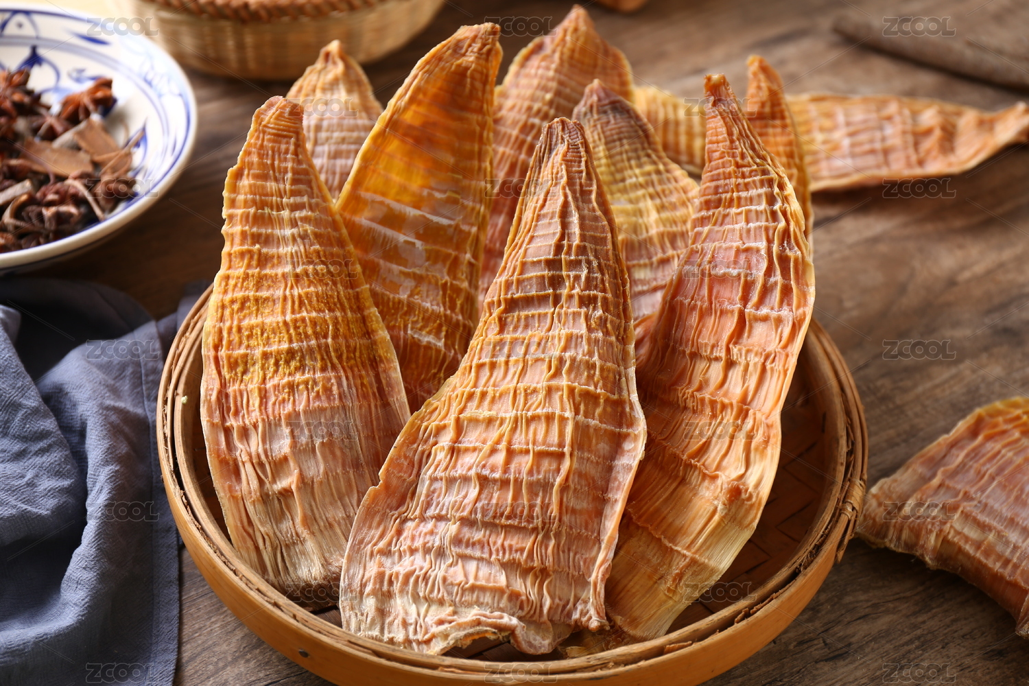 桌面上竹篓筐里摆放着冬笋尖干货笋干